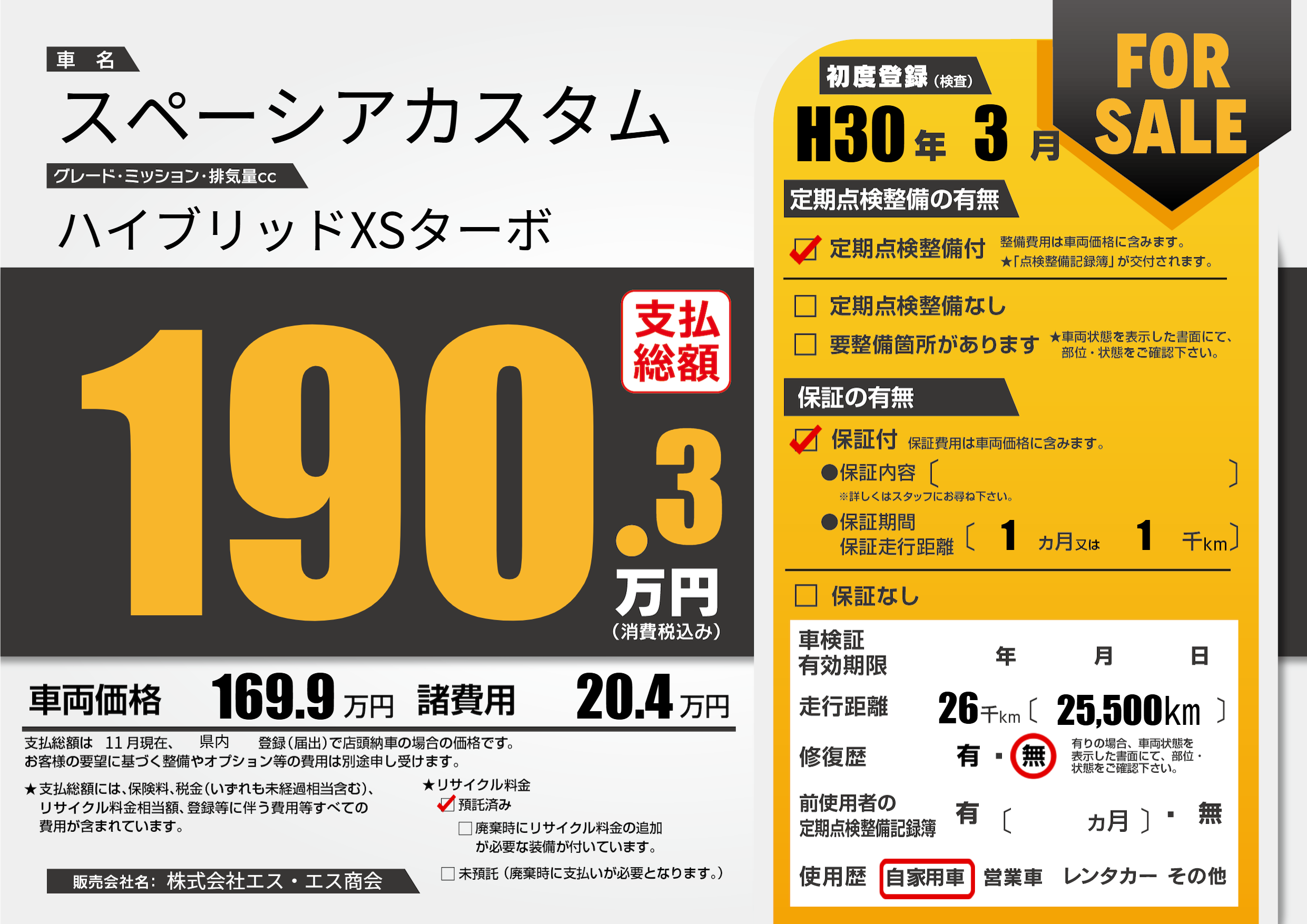 | 車名 | スペーシアカスタム | グレード ミッション 排気量 |