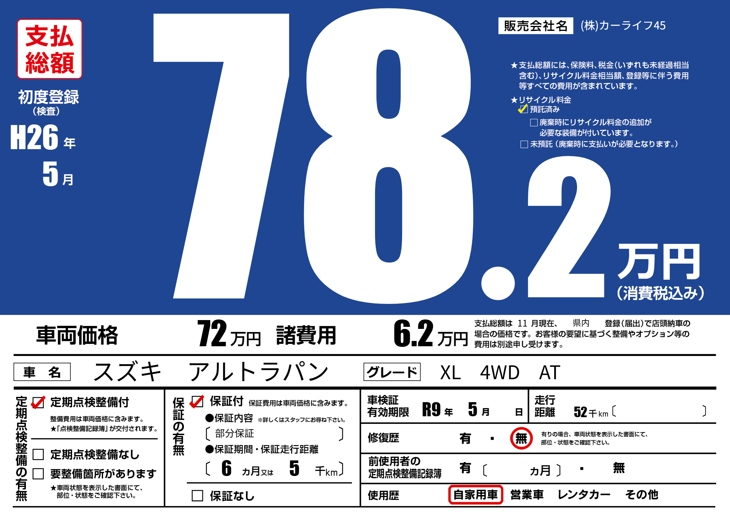 保証付き 保証内容(部分保証) 6ヶ月または(5)千kmまで |
