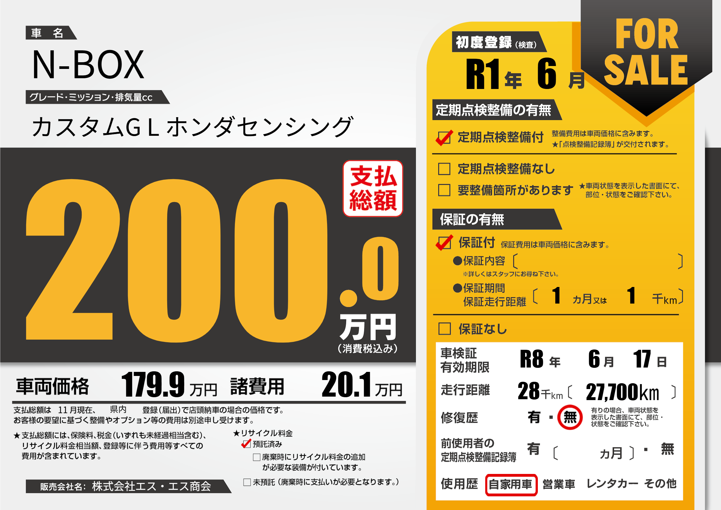 | 車名 | N-BOX | グレード ミッション 排気量 |