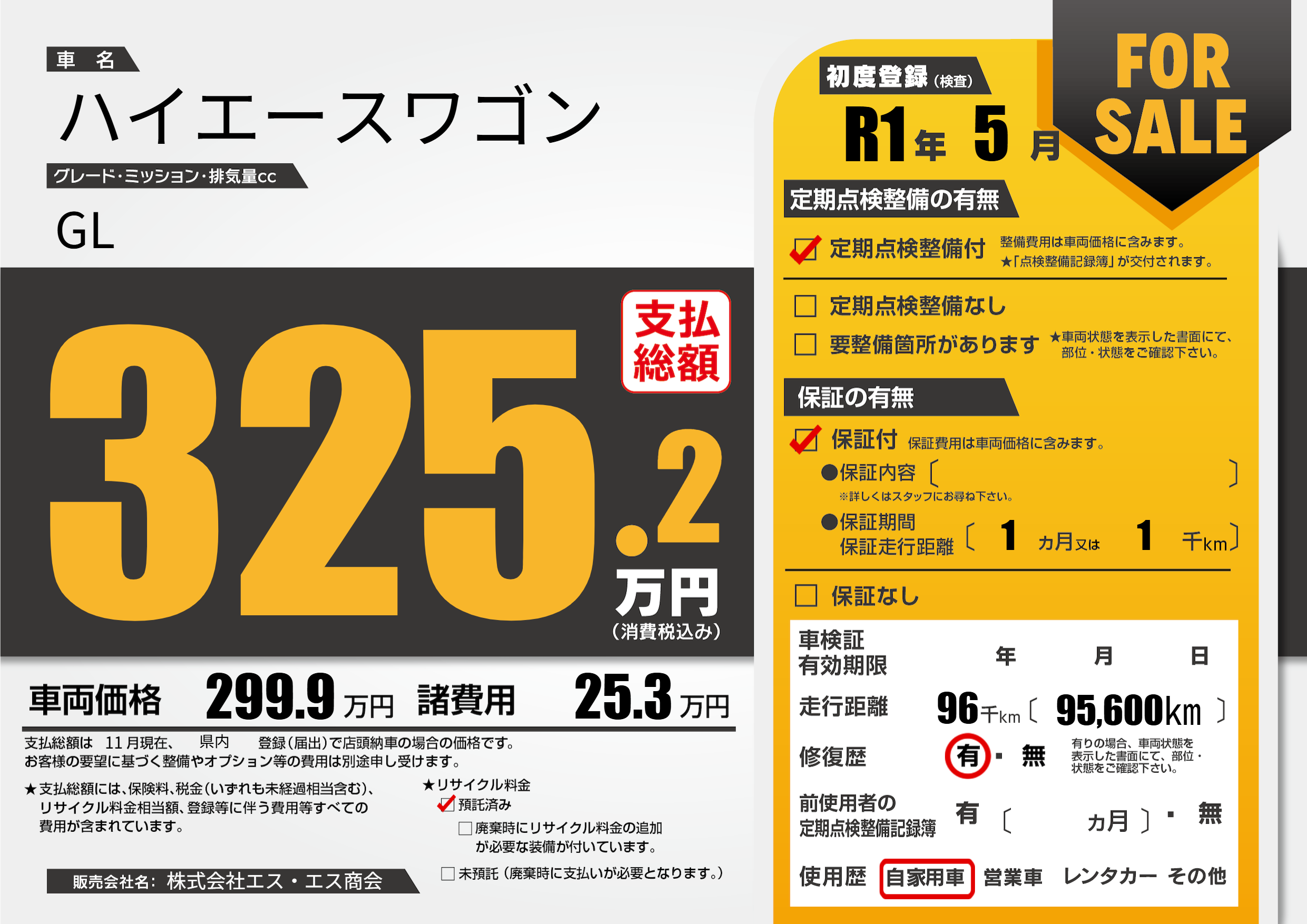 | 車名 | ハイエースワゴン | グレード ミッション 排気量 |