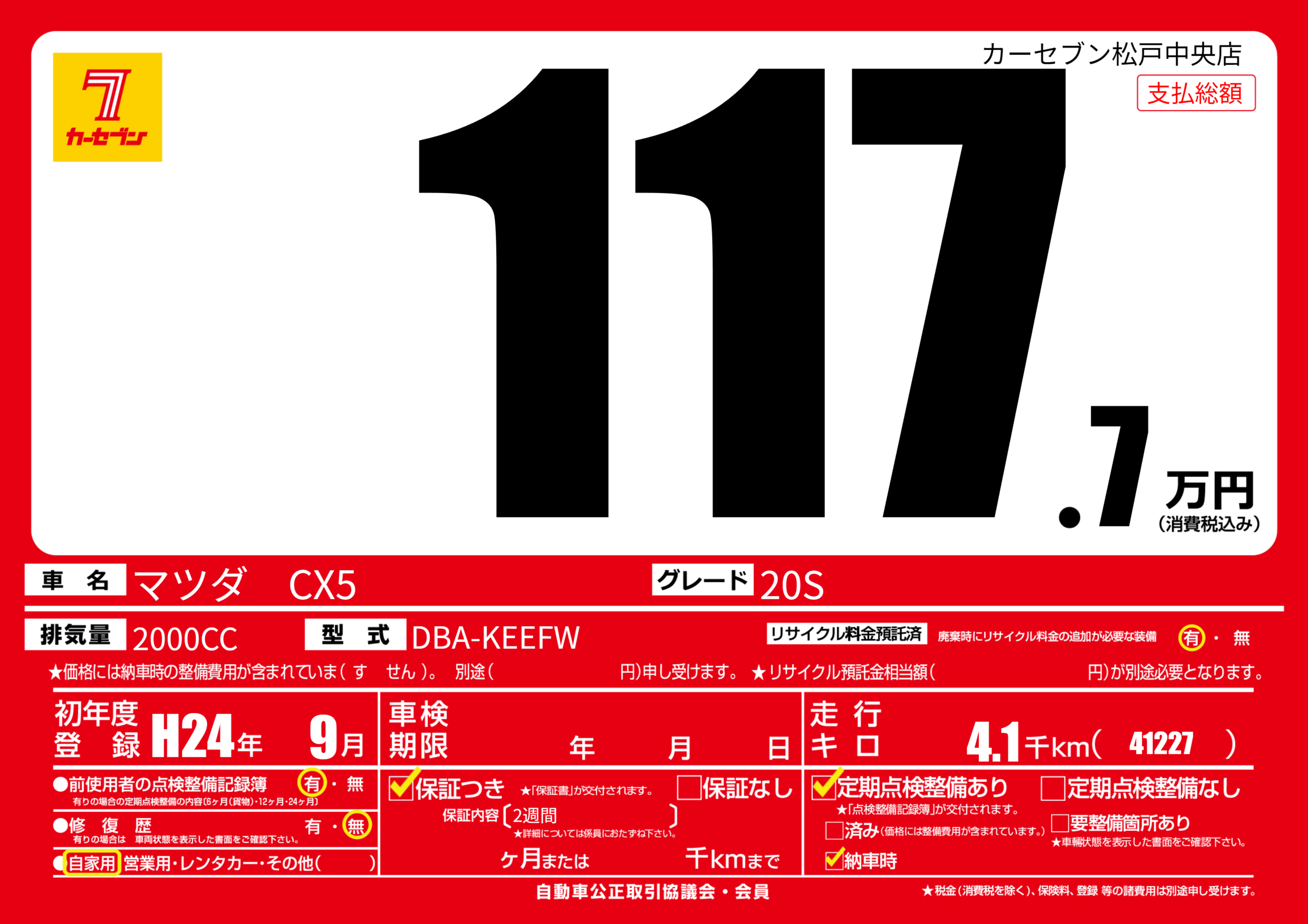 | 車名 | マツダ CX5 | グレード ミッション 排気量 |