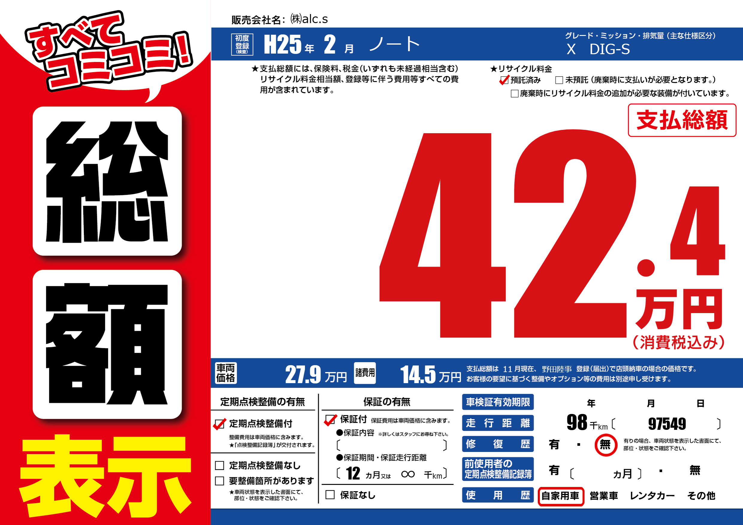 | 走行キロ | 9.8万km | 初年度登録 | H25年2月 |