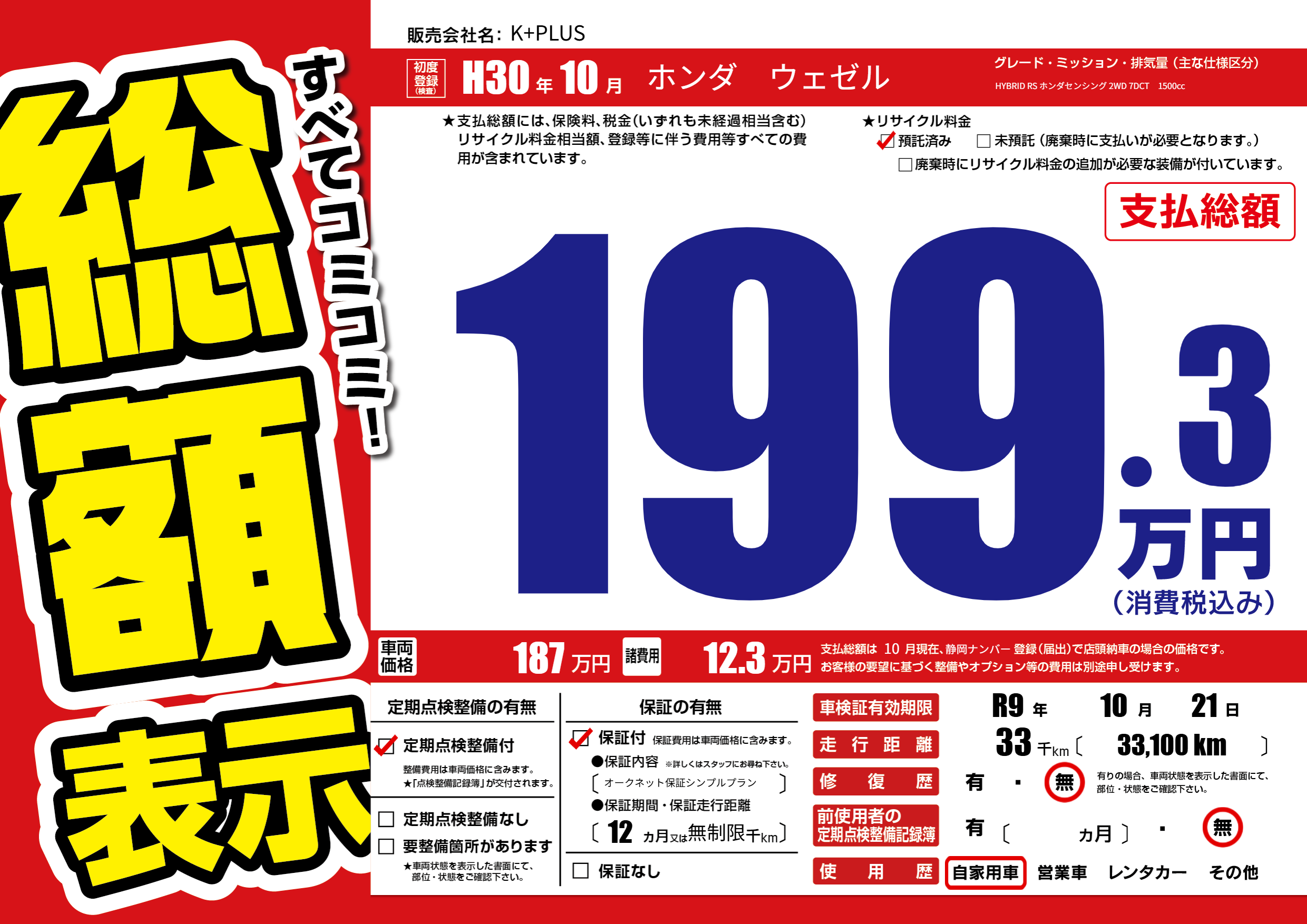 | 走行キロ | 3.3万km | 初年度登録 | H30年10月 |
