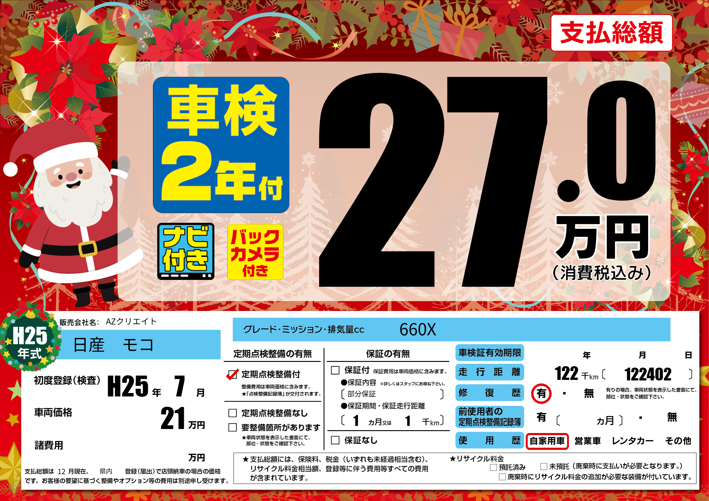 | 走行キロ | 12.2万km | 初年度登録 | H25年7月 |