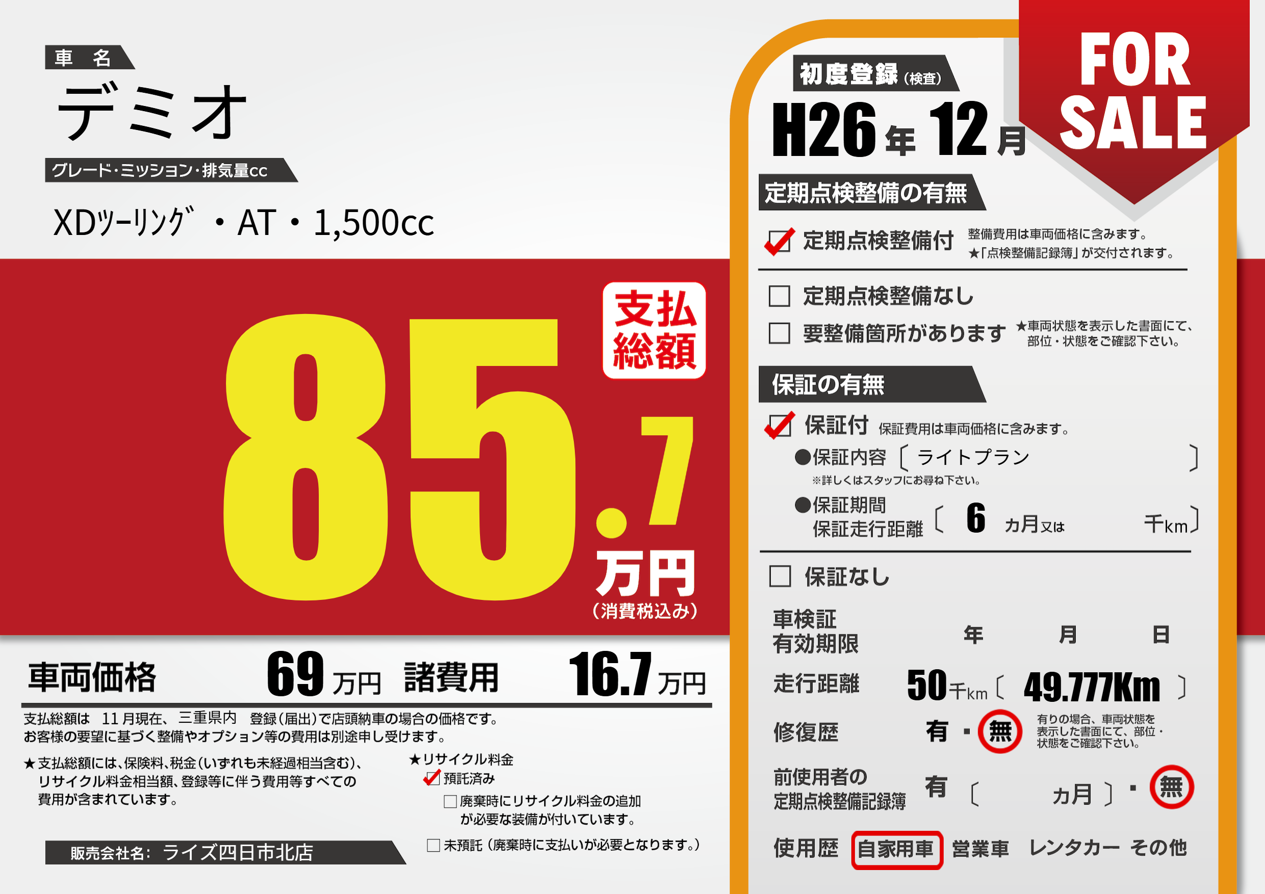 | 車名 | デミオ | グレード ミッション 排気量 |