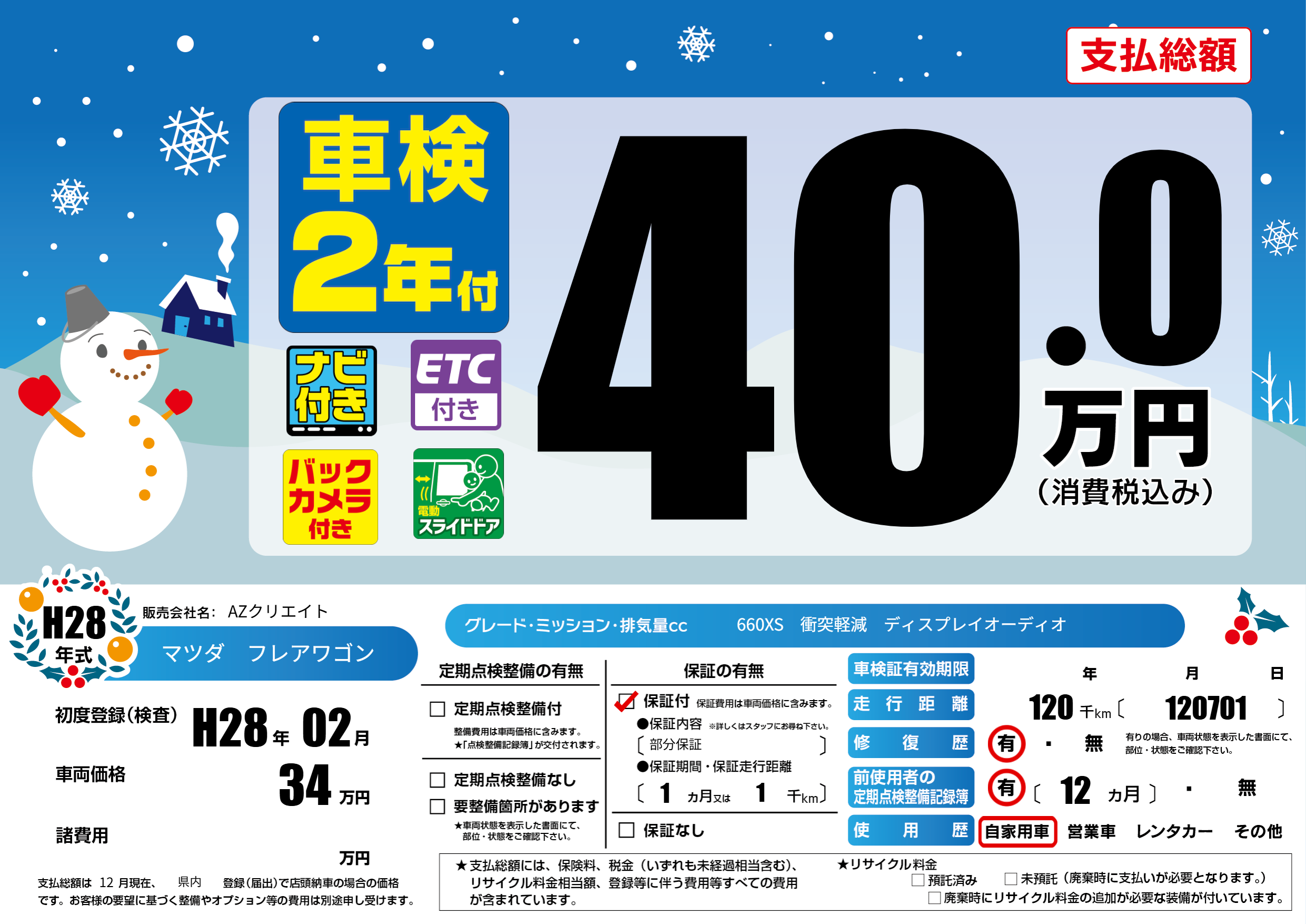 | 走行キロ | 12万km | 初年度登録 | H28年02月 |