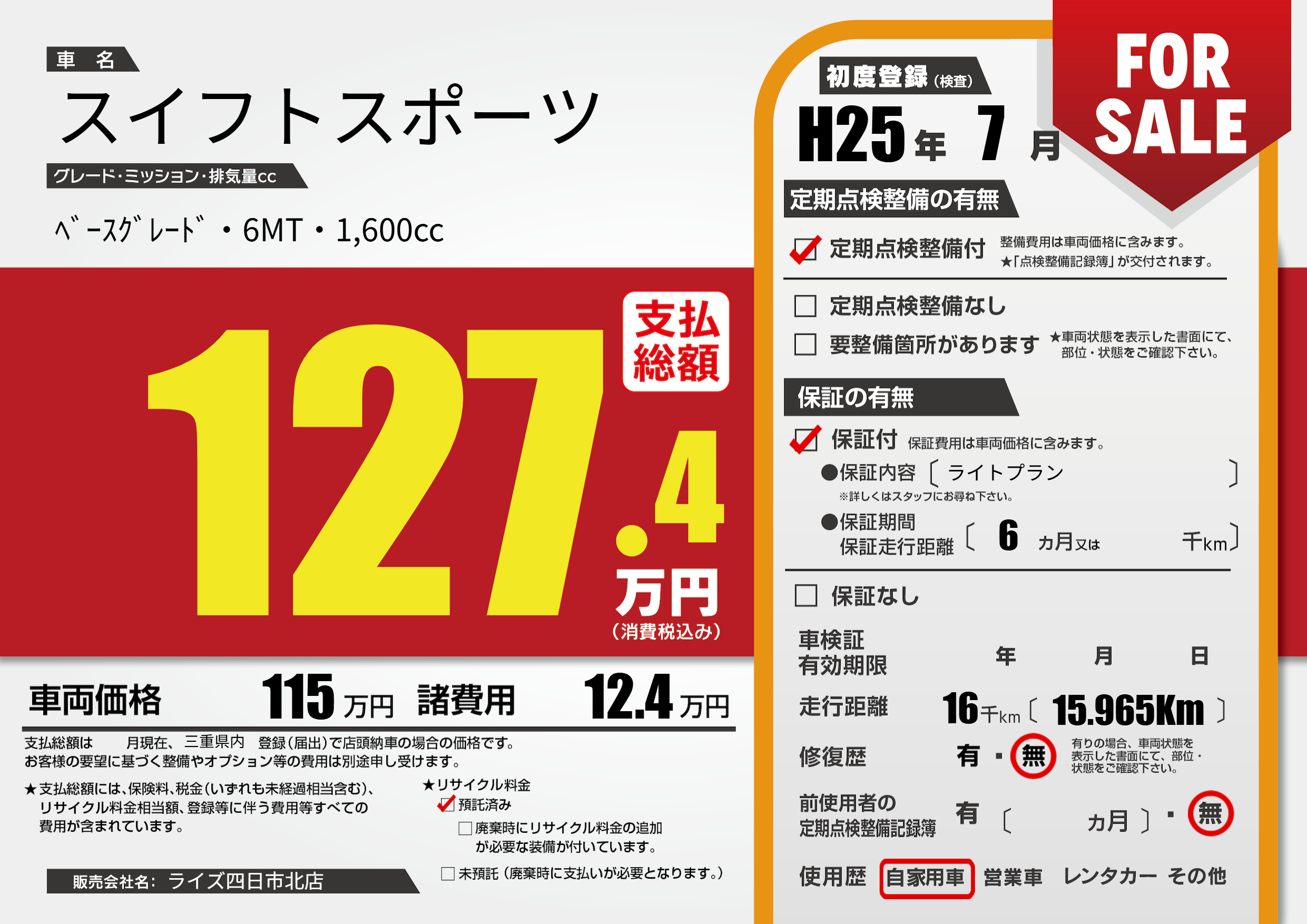 | 車名 | スイフトスポーツ | グレード ミッション 排気量 |