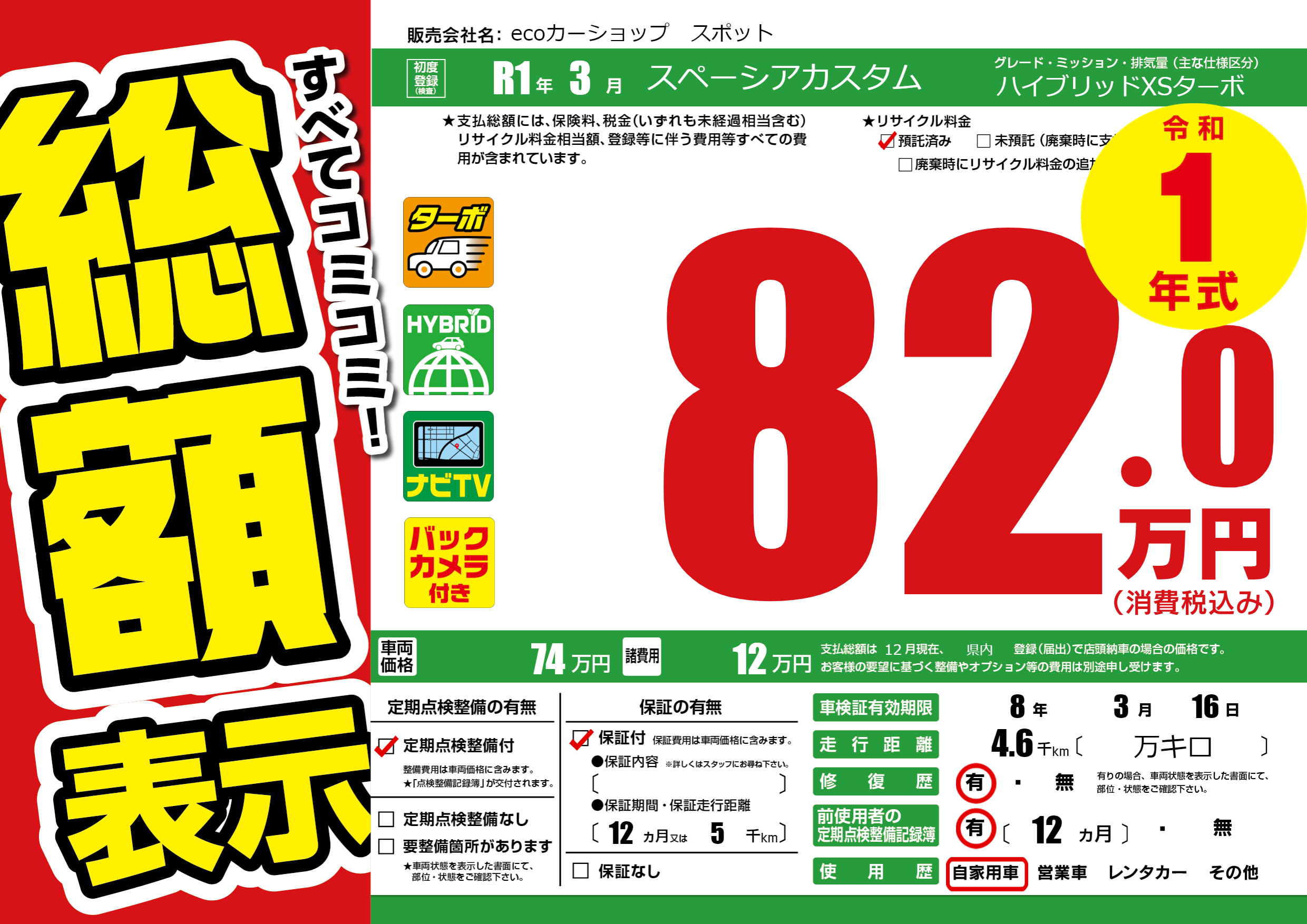| 車名 | スペーシアカスタム | グレード ミッション 排気量 |