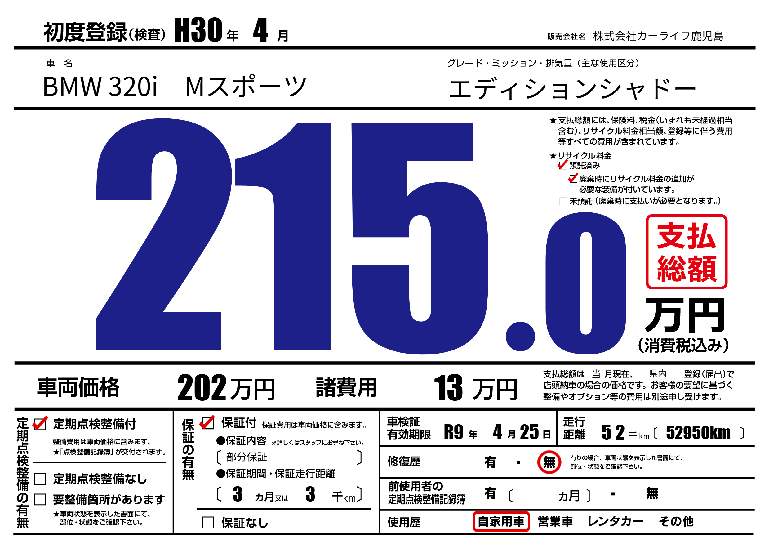 | 車名 | BMW 320i Mスポーツ | グレード ミッション 排気量 |