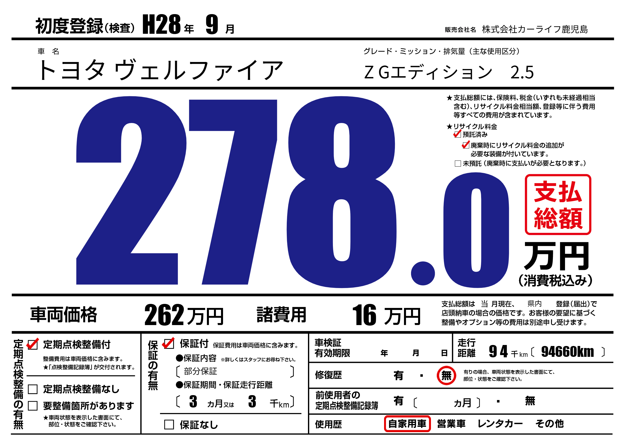 | 車名 | トヨタ ヴェルファイア | グレード ミッション 排気量 |