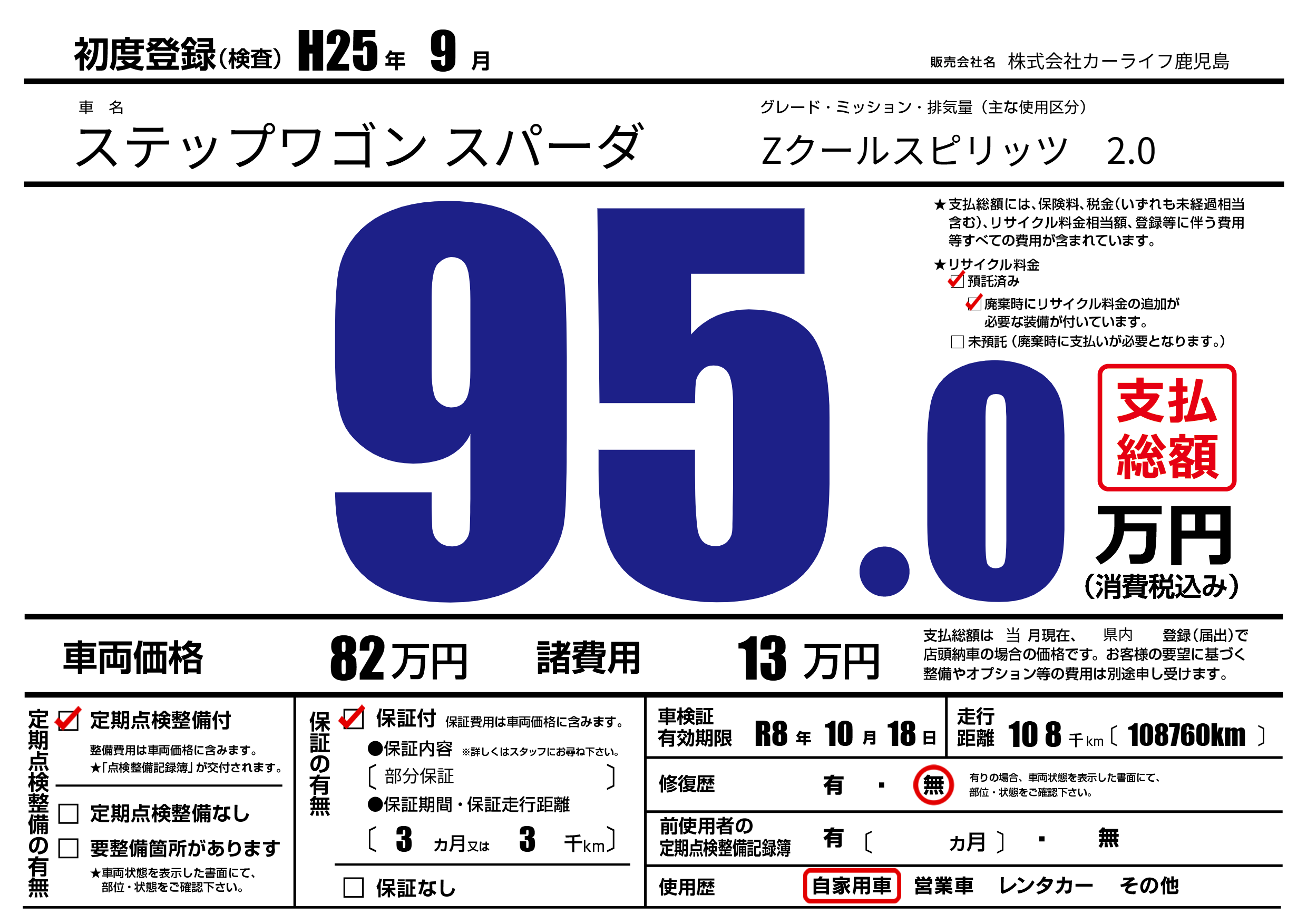 | 車名 | ステップワゴン スパーダ | グレード ミッション 排気量 |