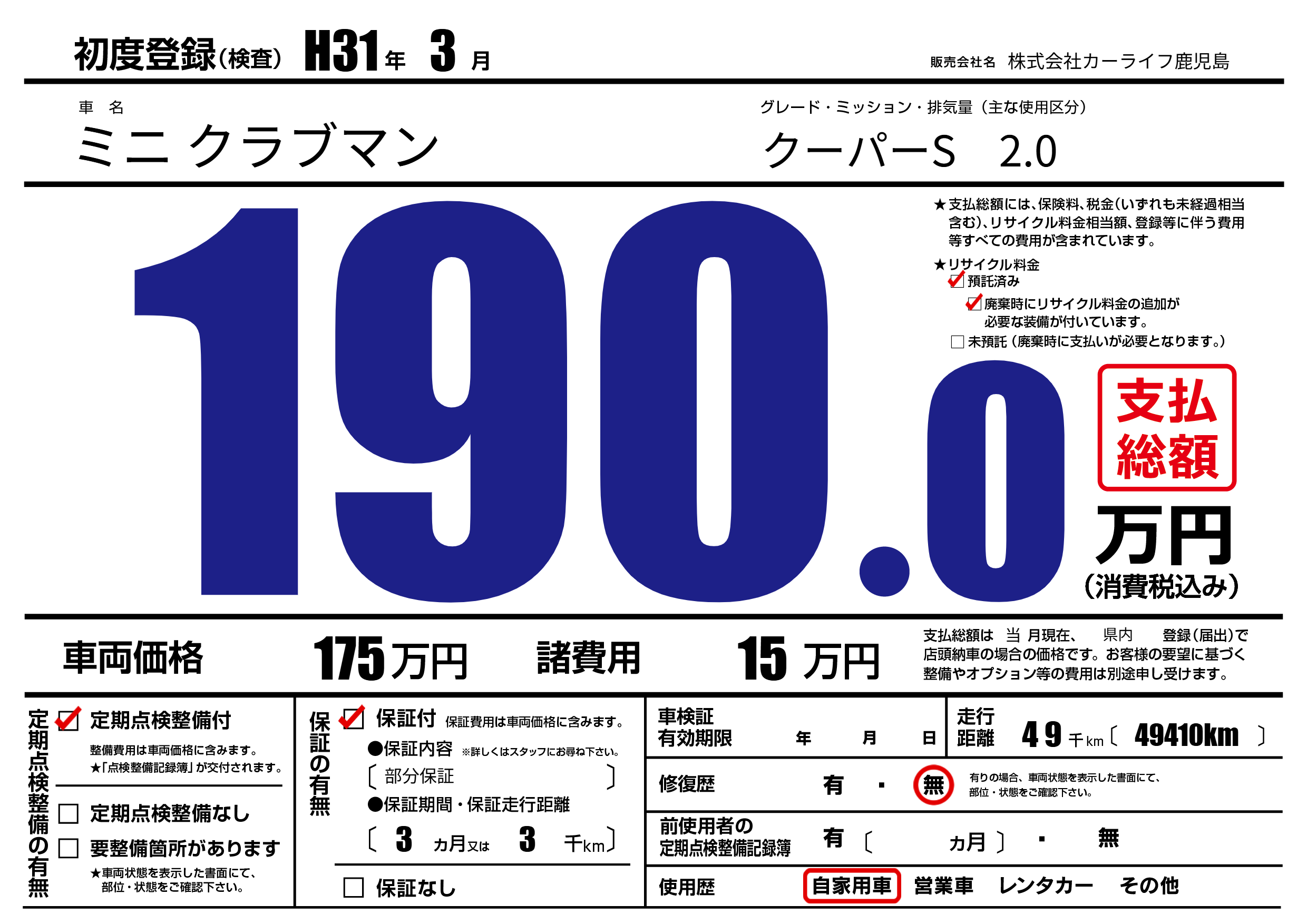 | 車名 | ミニ クラブマン | グレード ミッション 排気量 |