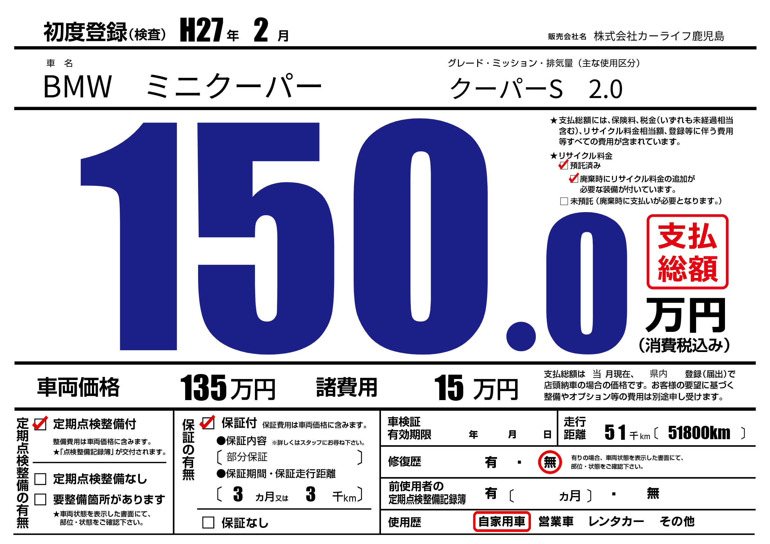 | 走行キロ | 0.5万km | 初年度登録 | H27年2月 |