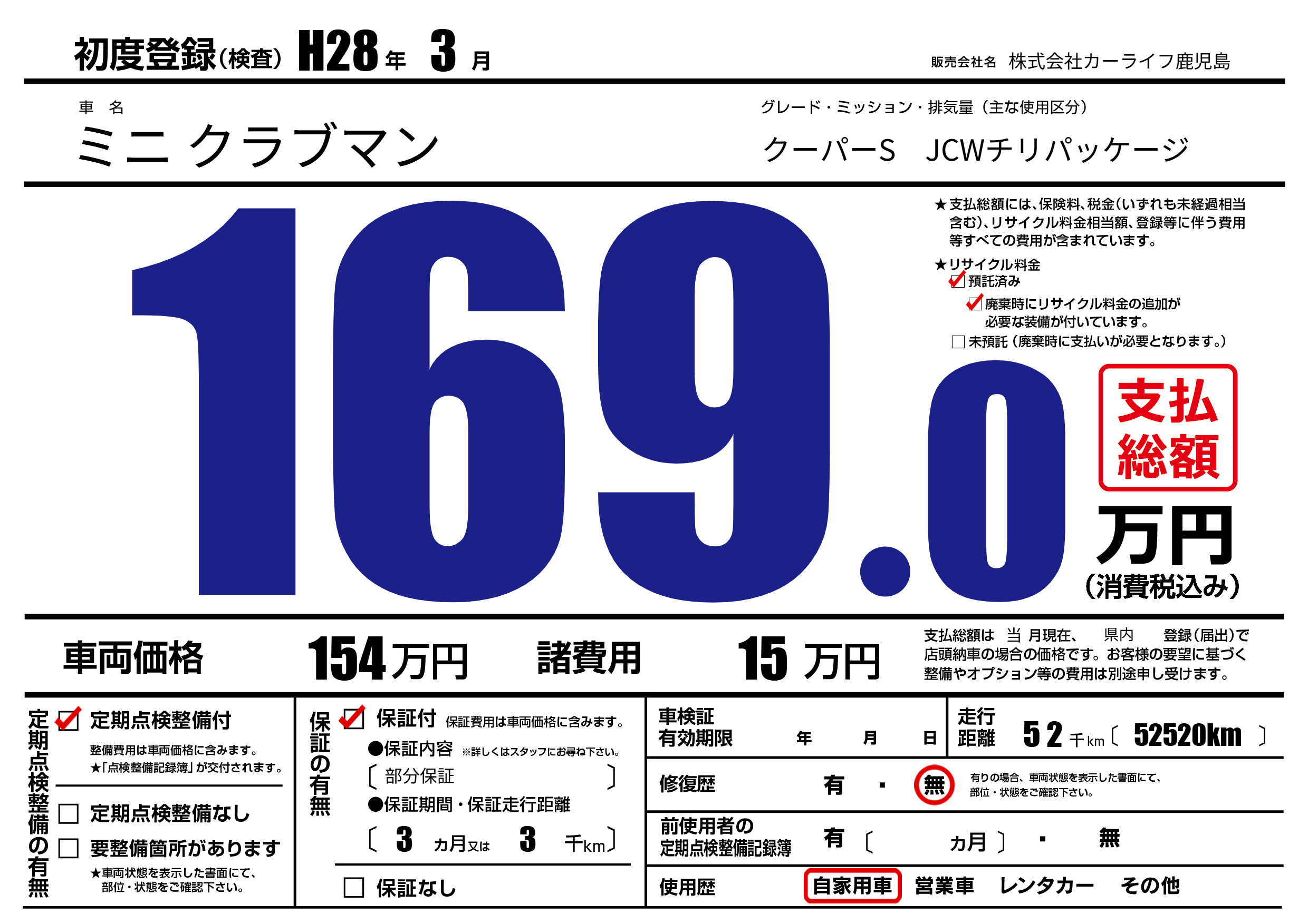 | 車名 | ミニ クラブマン | グレード ミッション 排気量 |