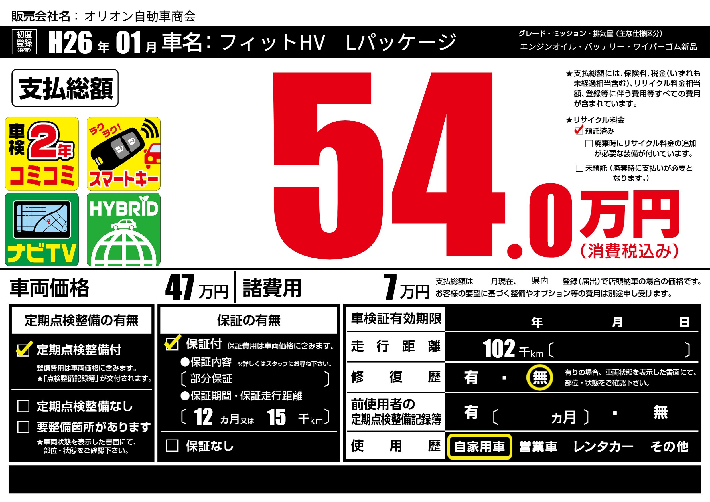 | 走行キロ | 10.2万km | 初年度登録 | H26年01月 |