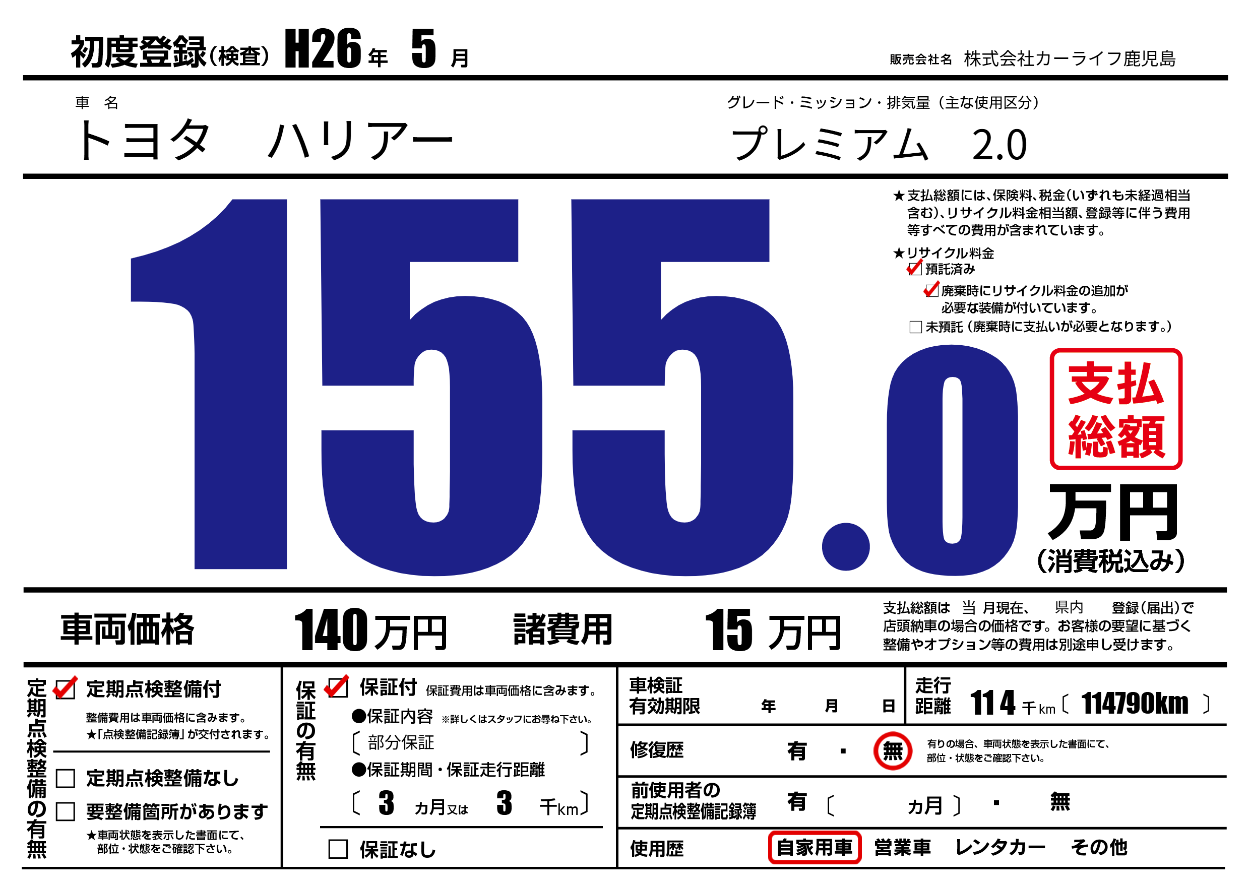 | 走行キロ | 1.1万km | 初年度登録 | H26年5月 |