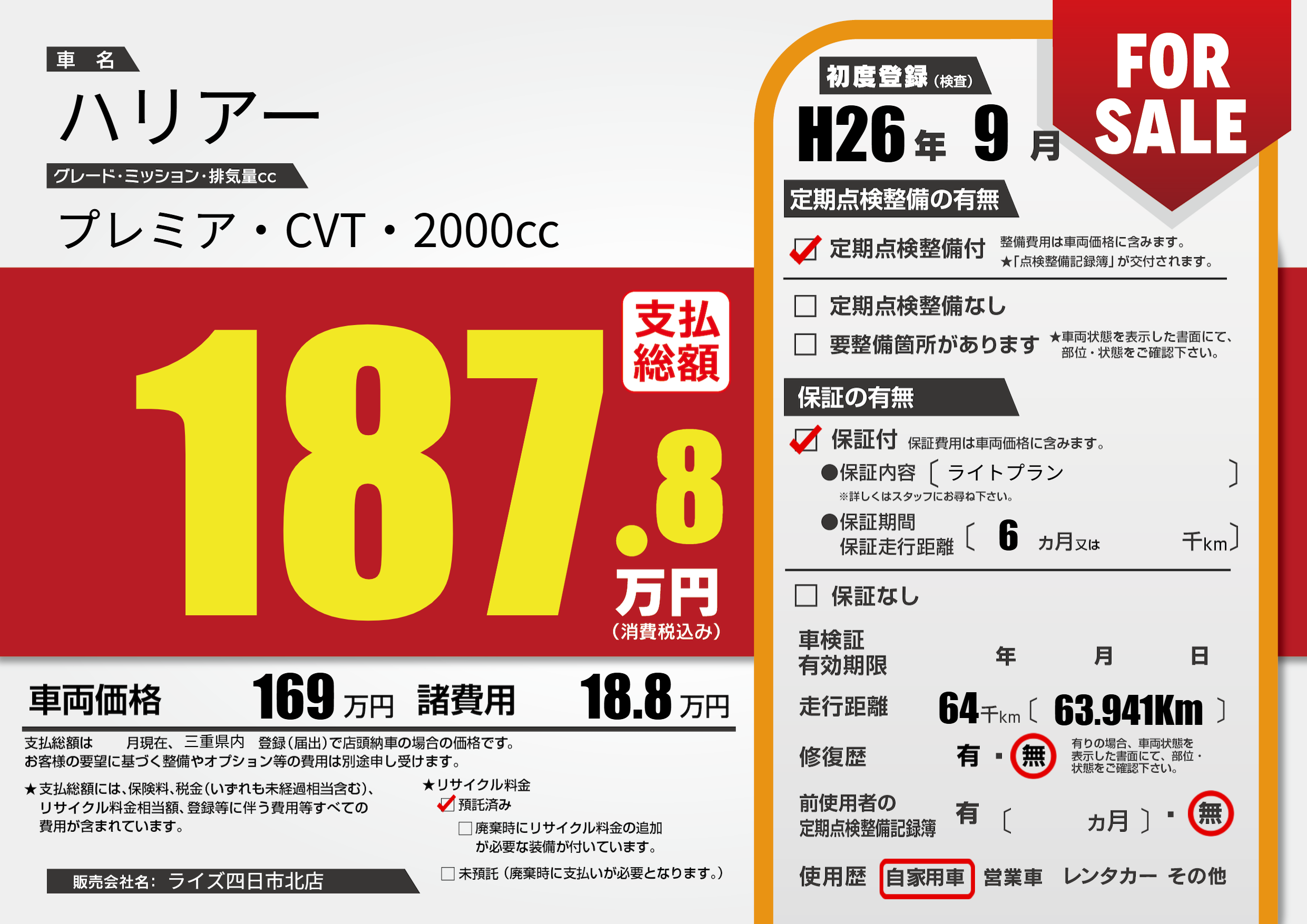 | 車名 | ハリアー | グレード ミッション 排気量 |