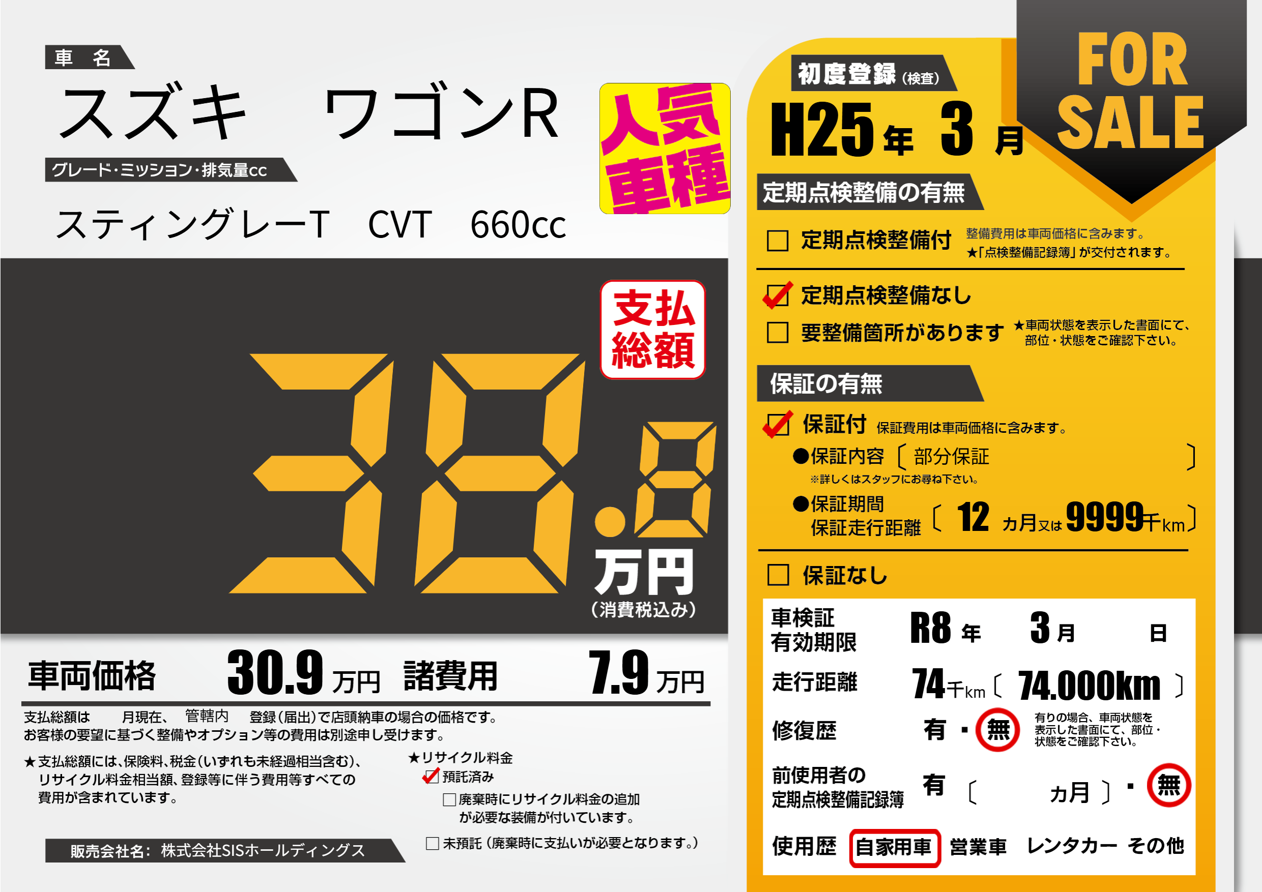 | 車名 | スズキ ワゴンR | グレード ミッション 排気量 |