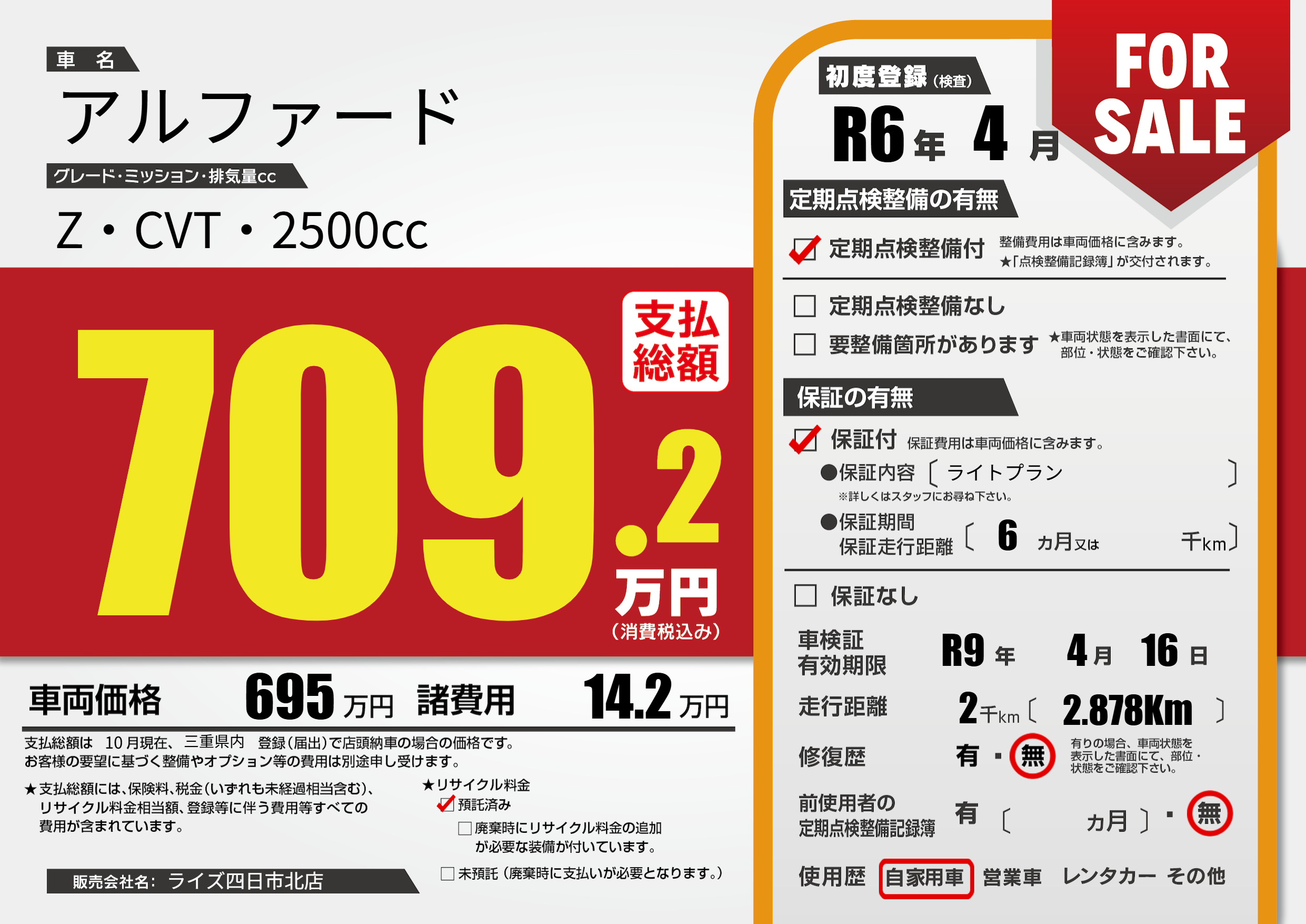 | 走行キロ | 0.2万km | 初年度登録 | R6年4月 |