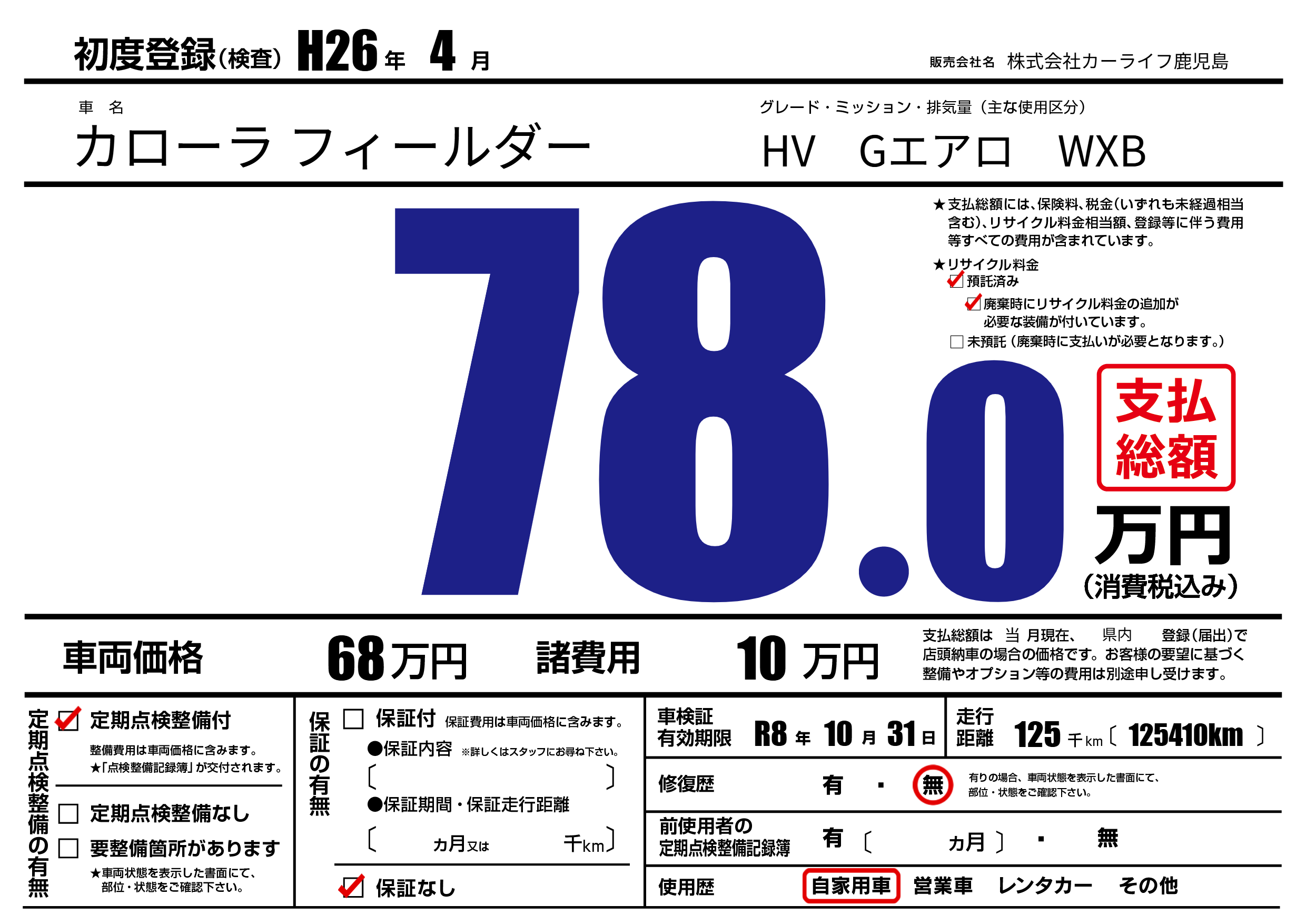 | 走行キロ | 12.5万km | 初年度登録 | H26年4月 |