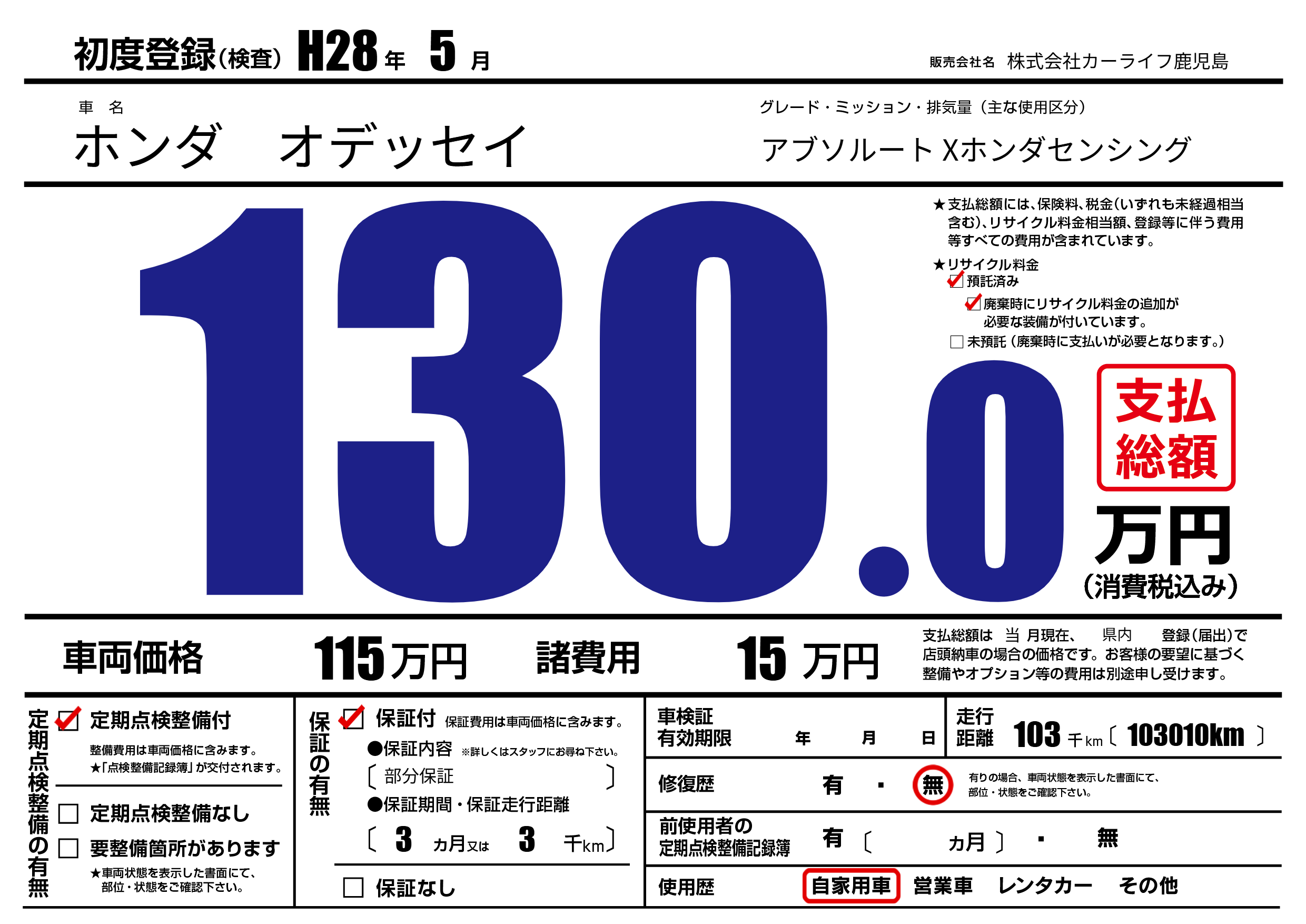 | 走行キロ | 10.3万km | 初年度登録 | H28年5月 |