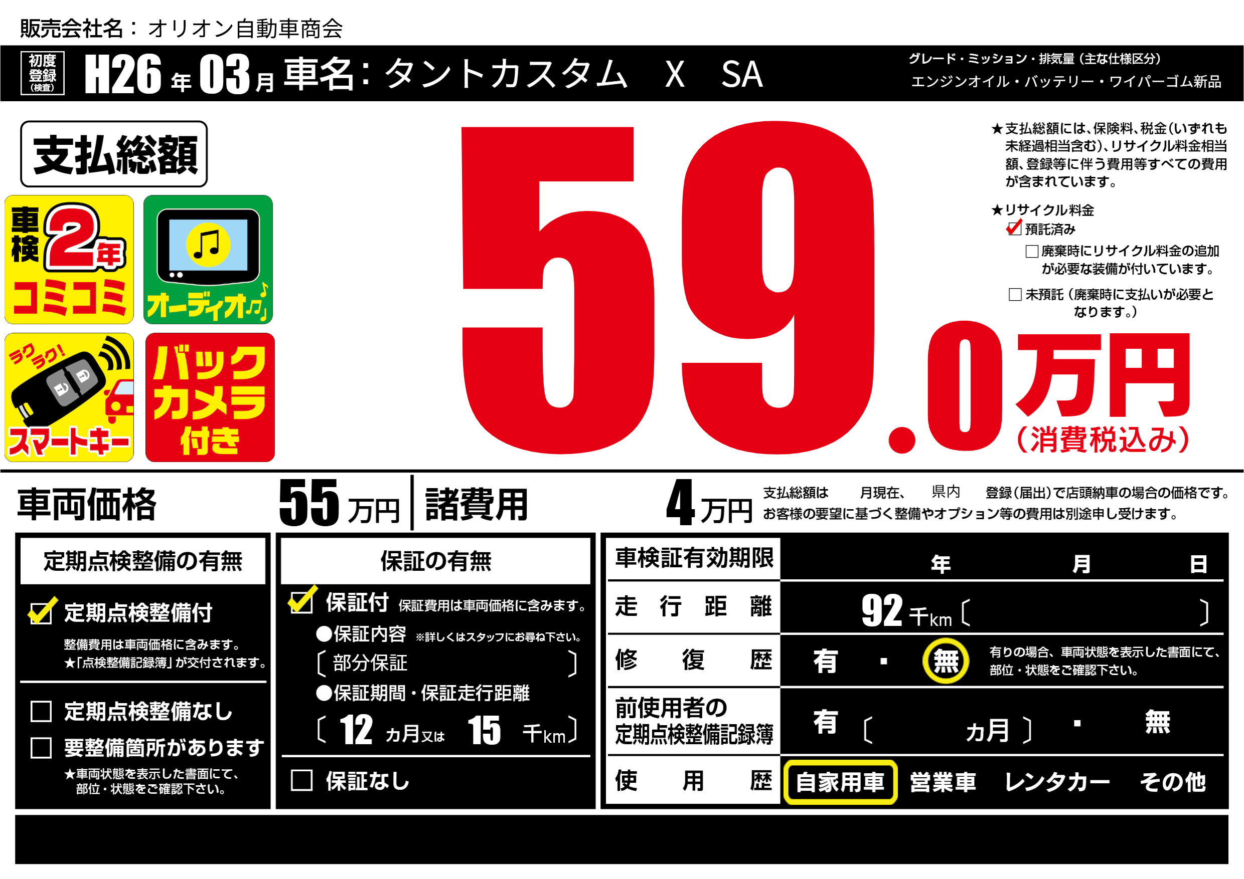 | 車名 | タントカスタム X SA | グレード ミッション 排気量 |