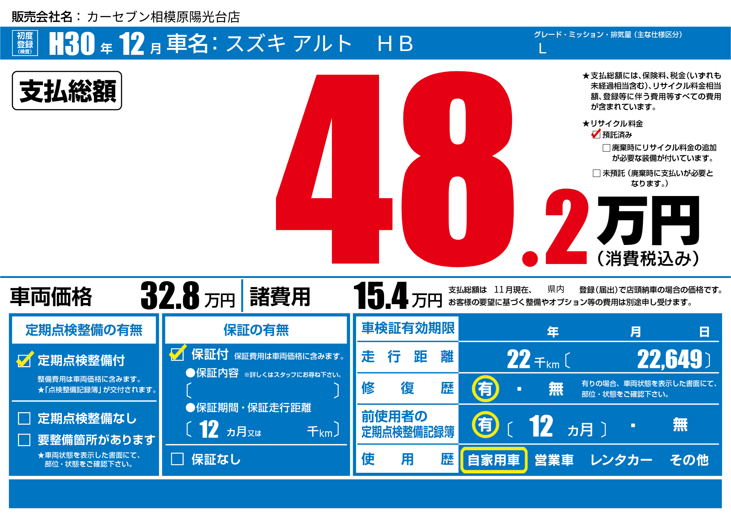 | 走行キロ | 2.2万km | 初年度登録 | H30年12月 |