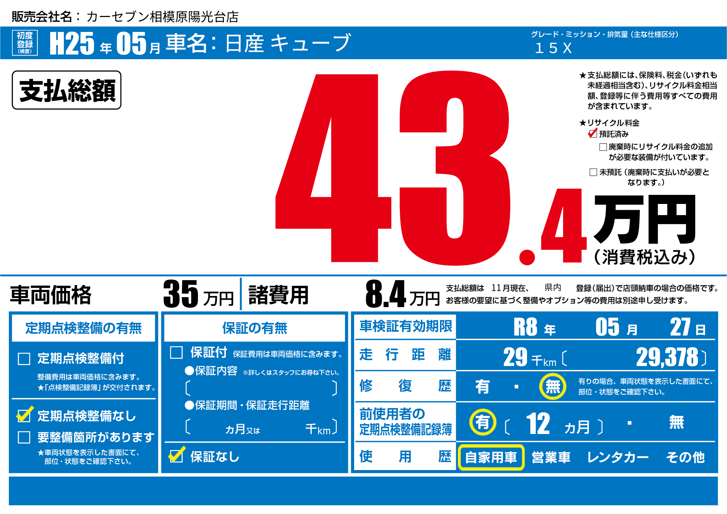 | 車名 | 日産 キューブ | グレード ミッション 排気量 |