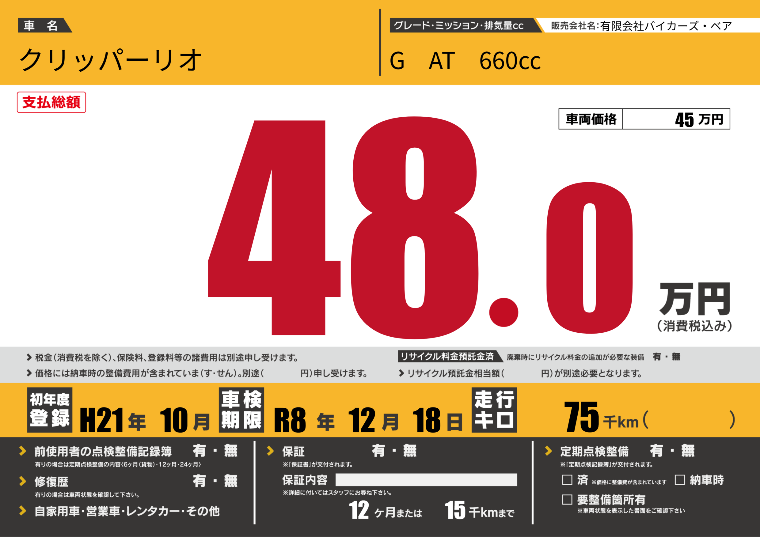保証なし 保証内容(---) 12ヶ月または(15)千kmまで |