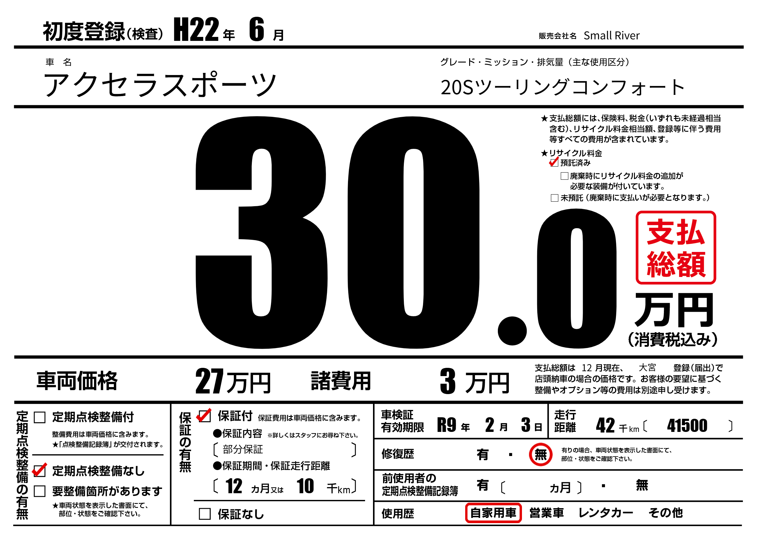 | 走行キロ | 4.2万km | 初年度登録 | H22年6月 |
