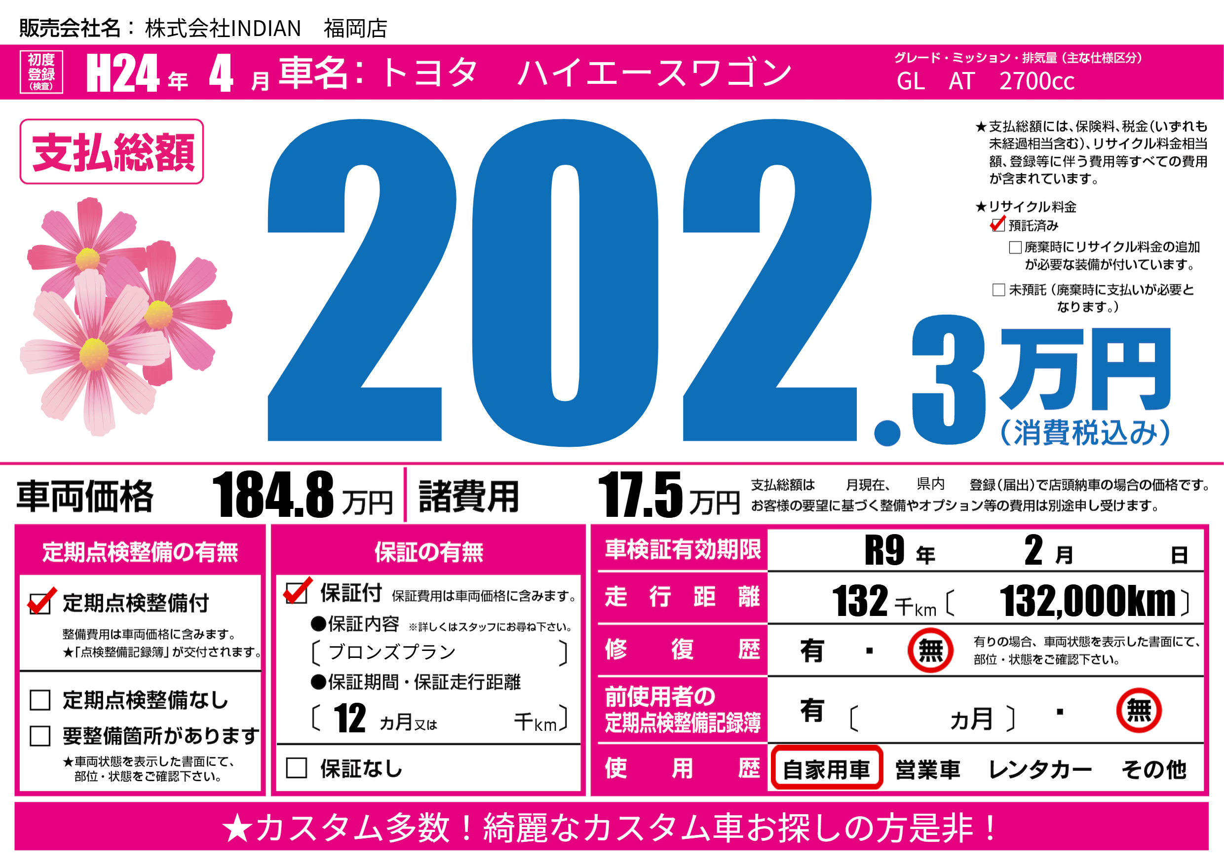 なし | 車検制限 | R9年2月---月 |