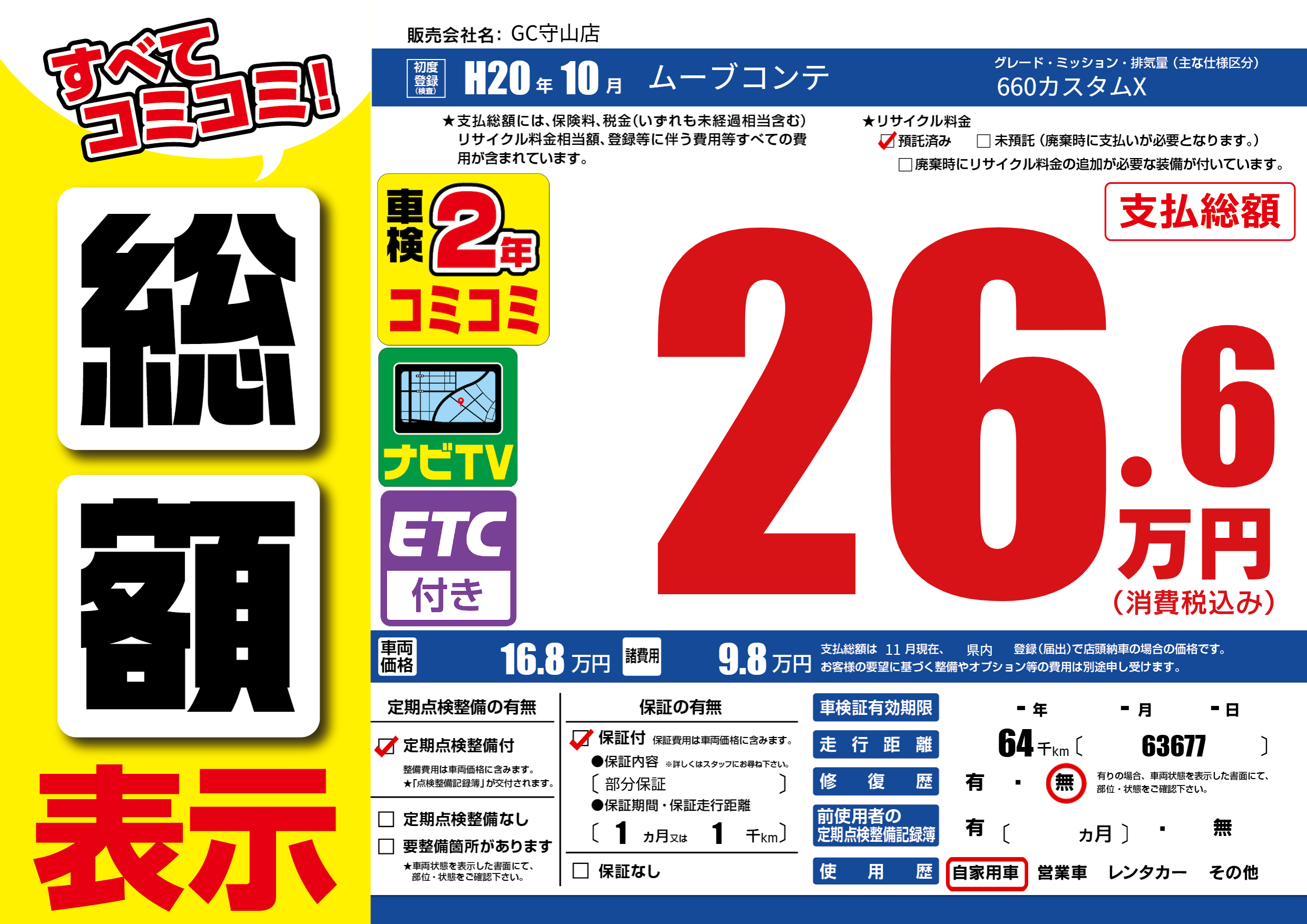 | 走行キロ | 6.4万km | 初年度登録 | H20年10月 |