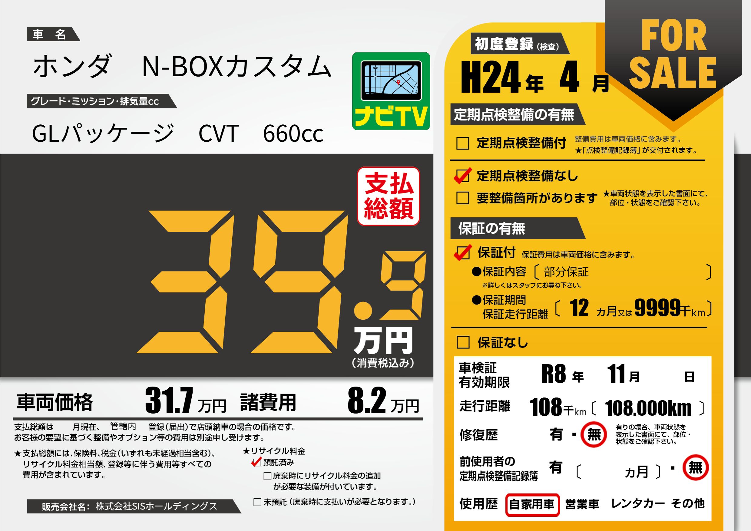 | 走行キロ | 10.8万km | 初年度登録 | H24年4月 |