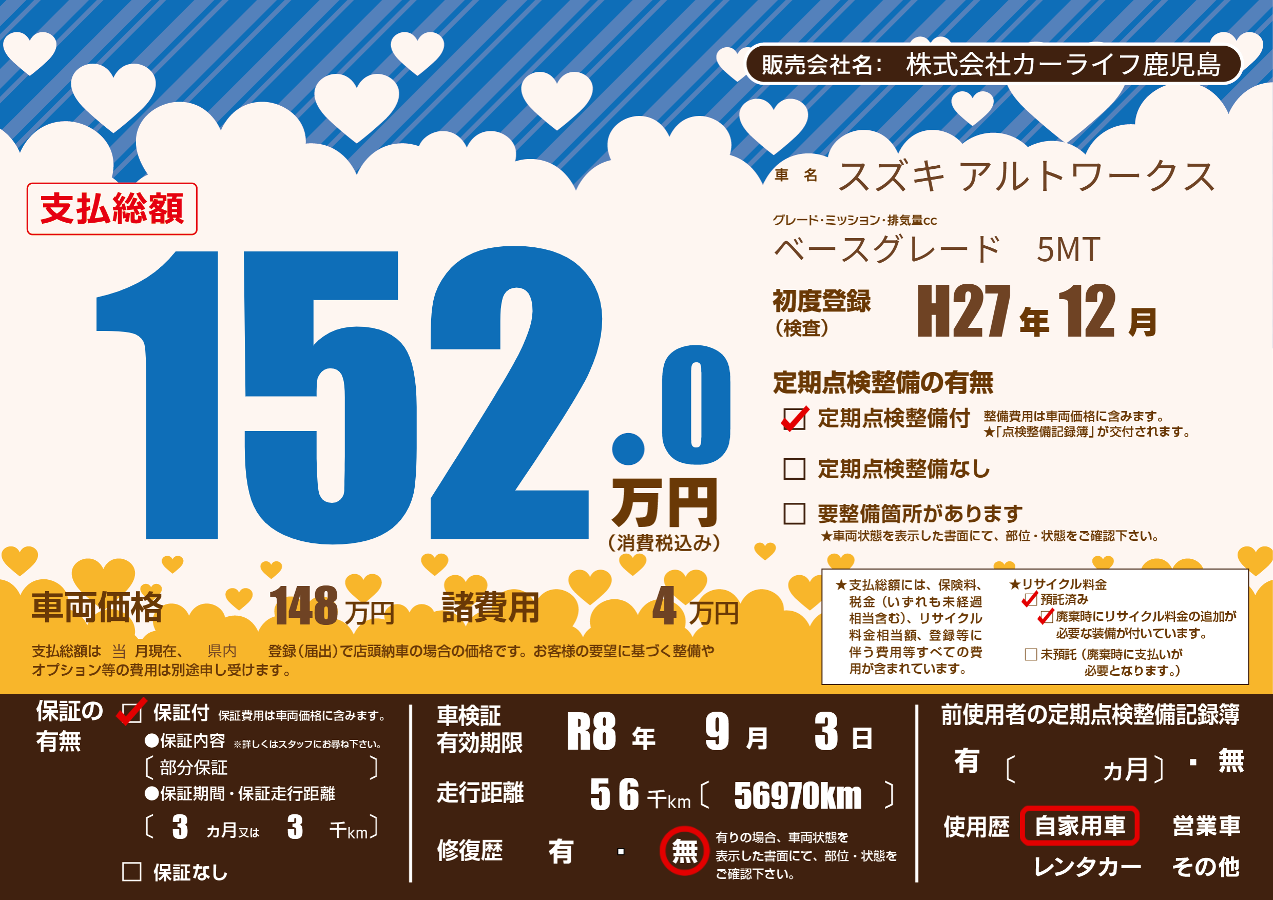 | 走行キロ | 0.5万km | 初年度登録 | H27年12月 |