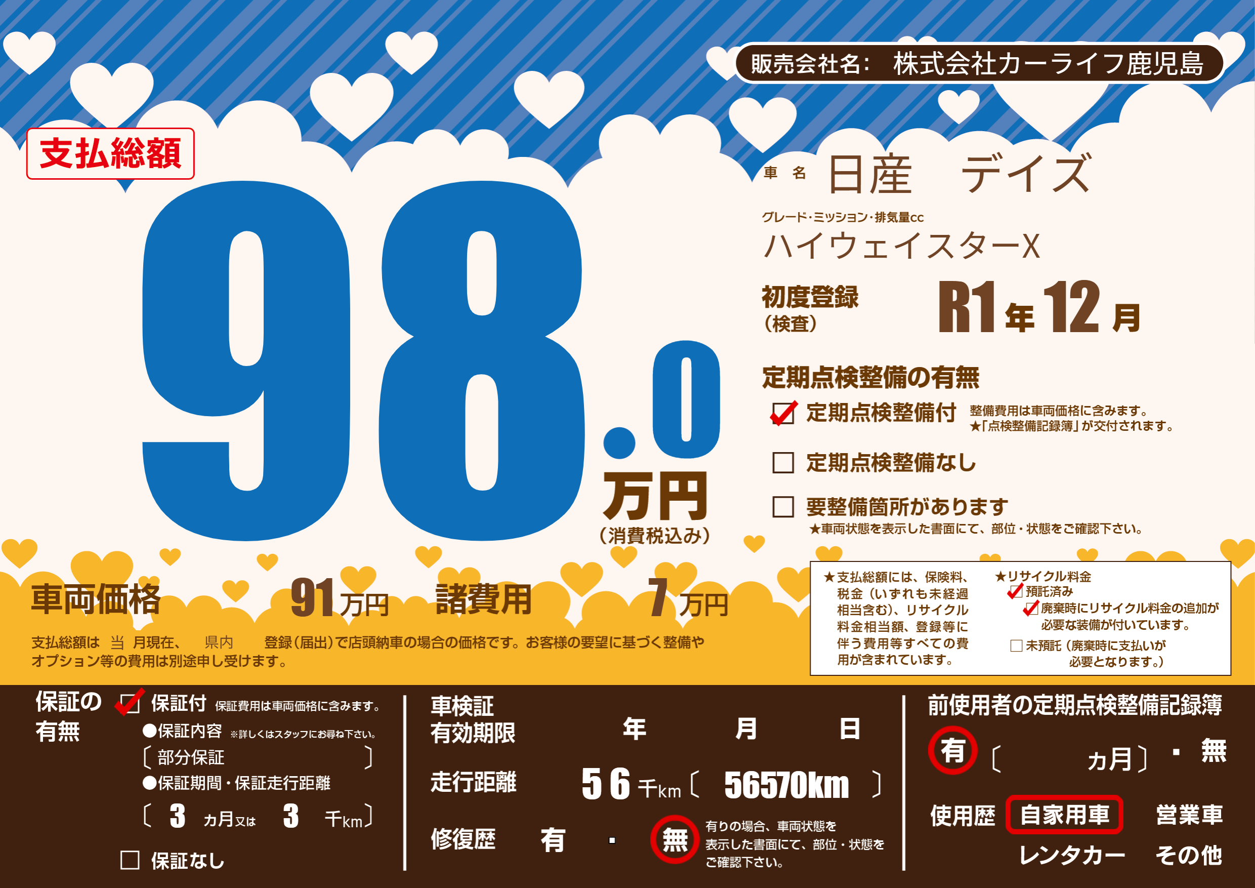 | 車名 | 日産 デイズ | グレード ミッション 排気量 |