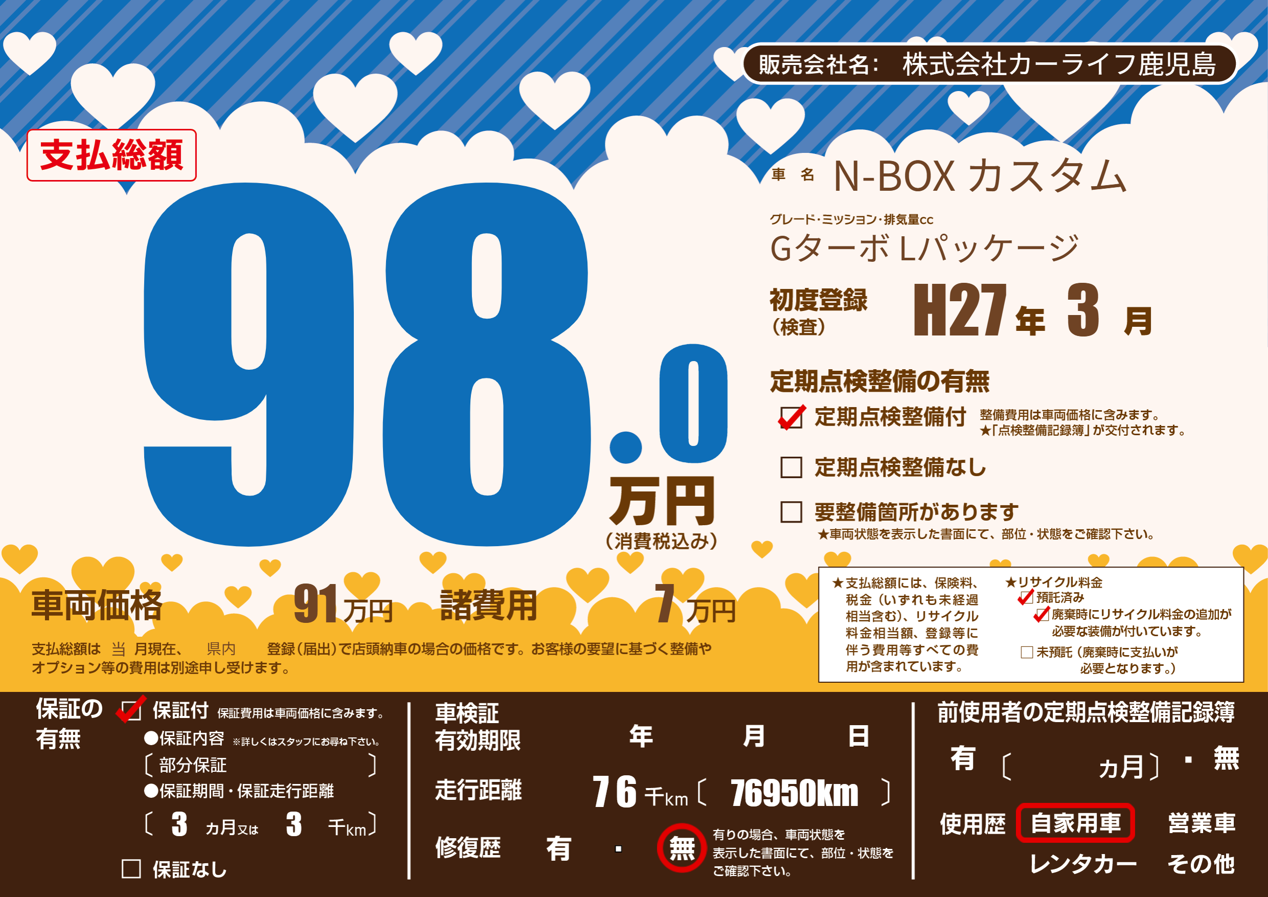 保証付き 保証内容(部分保証) 3ヶ月または(3)千kmまで |