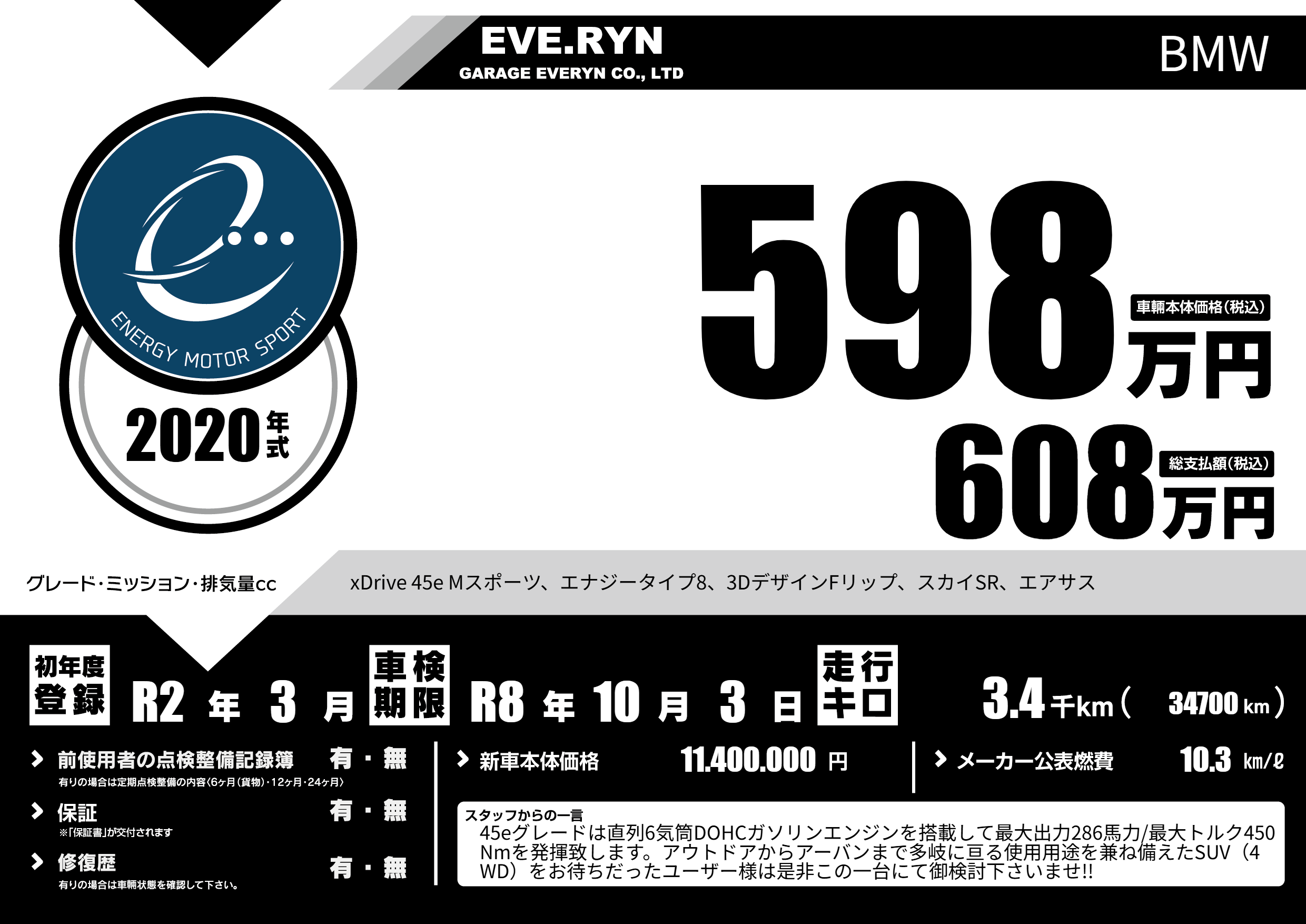 xDrive 45e Mスポーツ、エナジータイプ8、3DデザインFリップ、スカイSR、エアサス |
