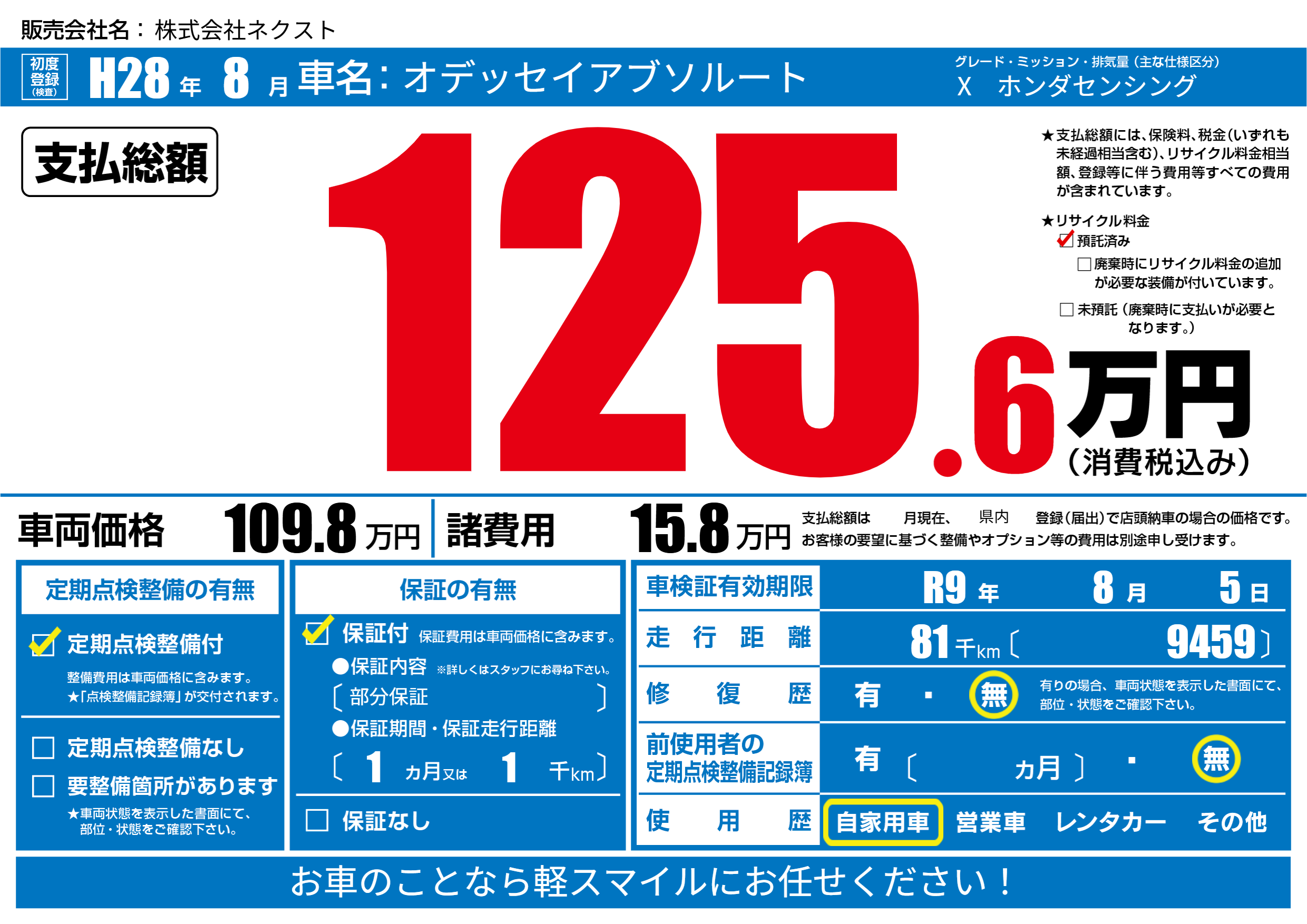 | 走行キロ | 8.1万km | 初年度登録 | H28年8月 |