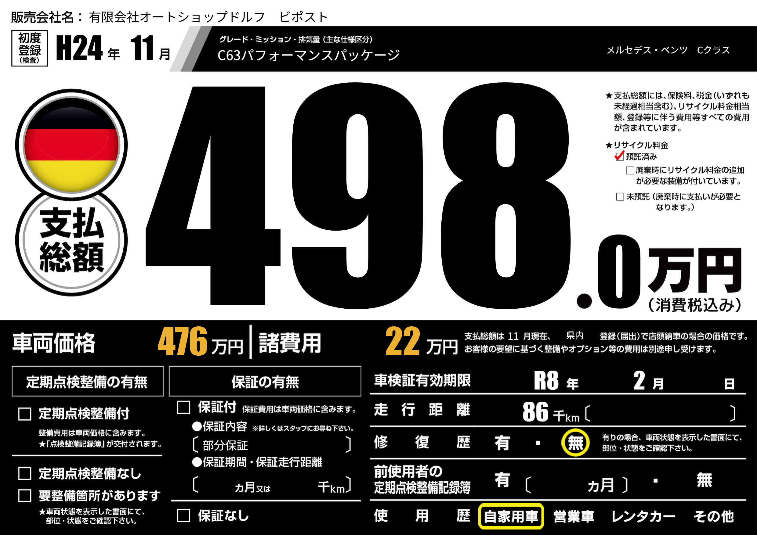 | 車名 | メルセデス・ベンツ Cクラス | グレード ミッション 排気量 |