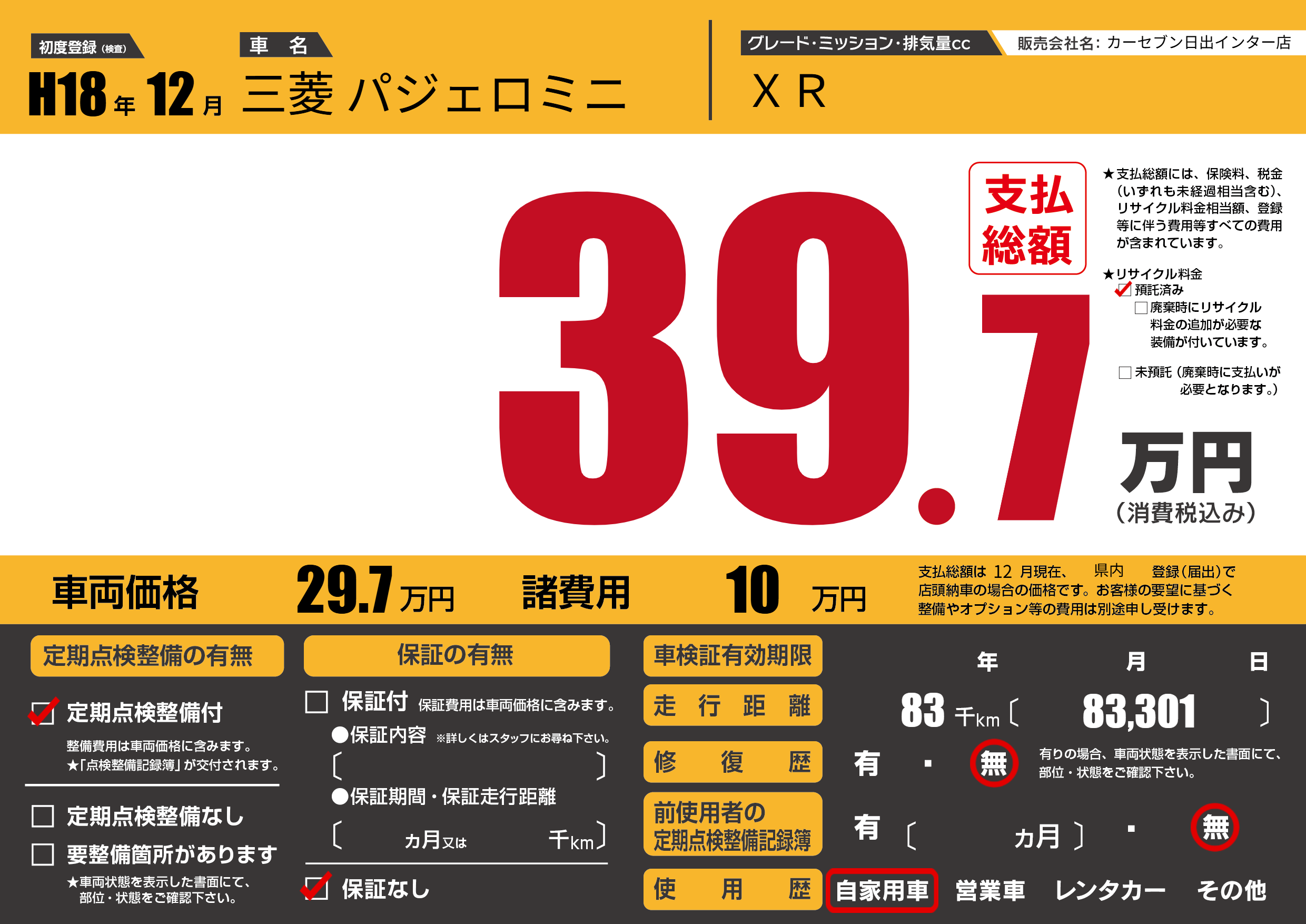 | 走行キロ | 8.3万km | 初年度登録 | H18年12月 |