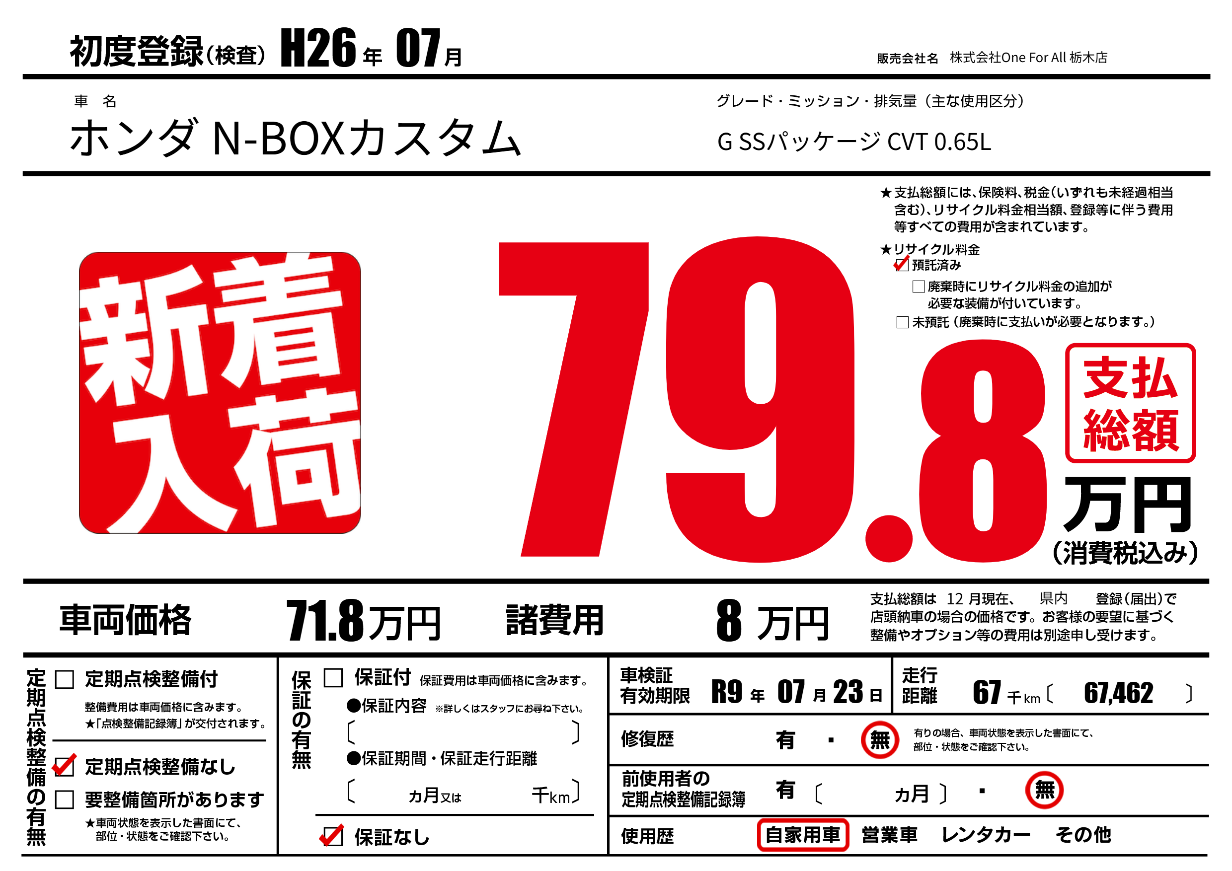 | 走行キロ | 6.7万km | 初年度登録 | H26年07月 |