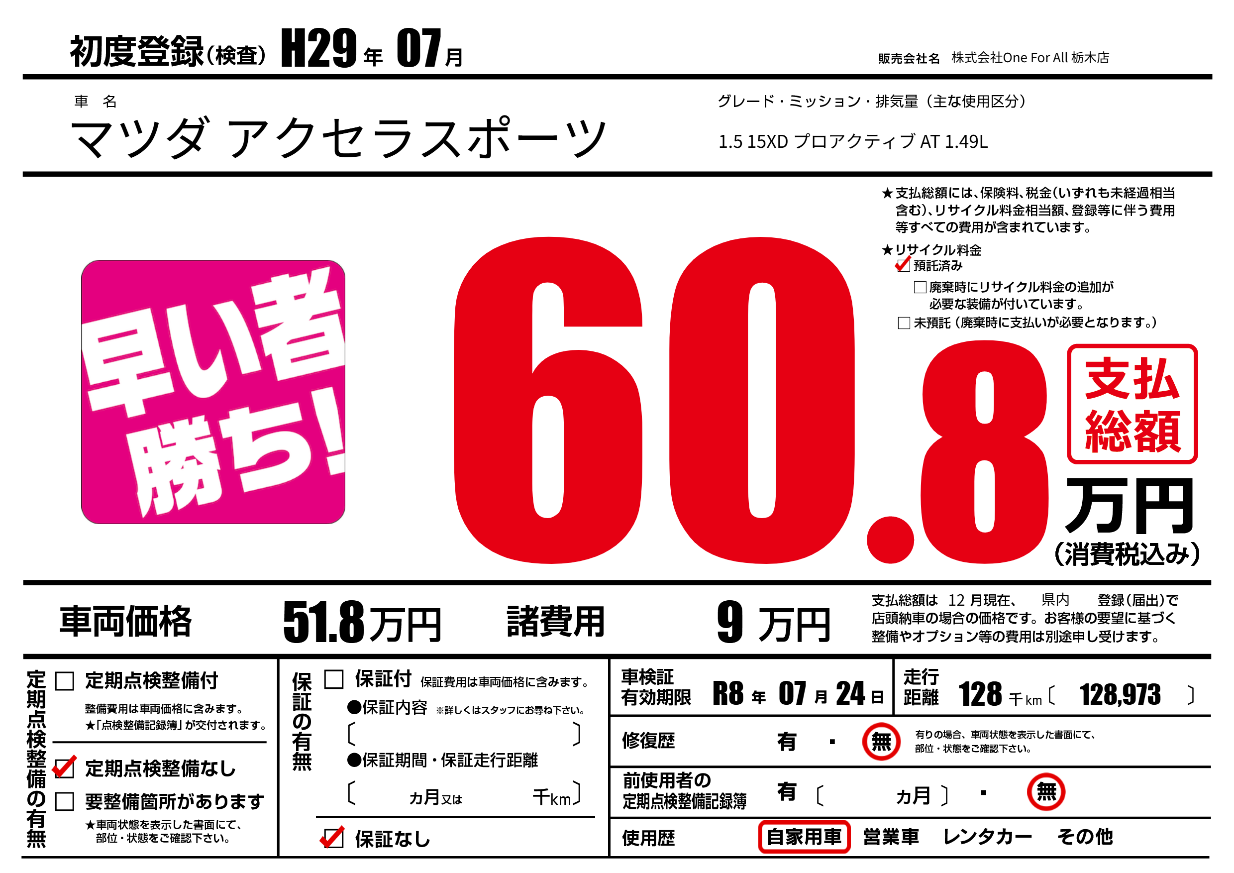 | 車名 | マツダ アクセラスポーツ | グレード ミッション 排気量 |