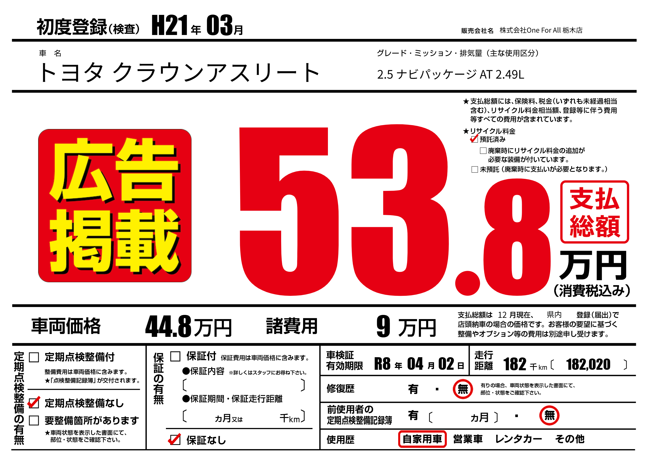 | 車名 | トヨタ クラウンアスリート | グレード ミッション 排気量 |