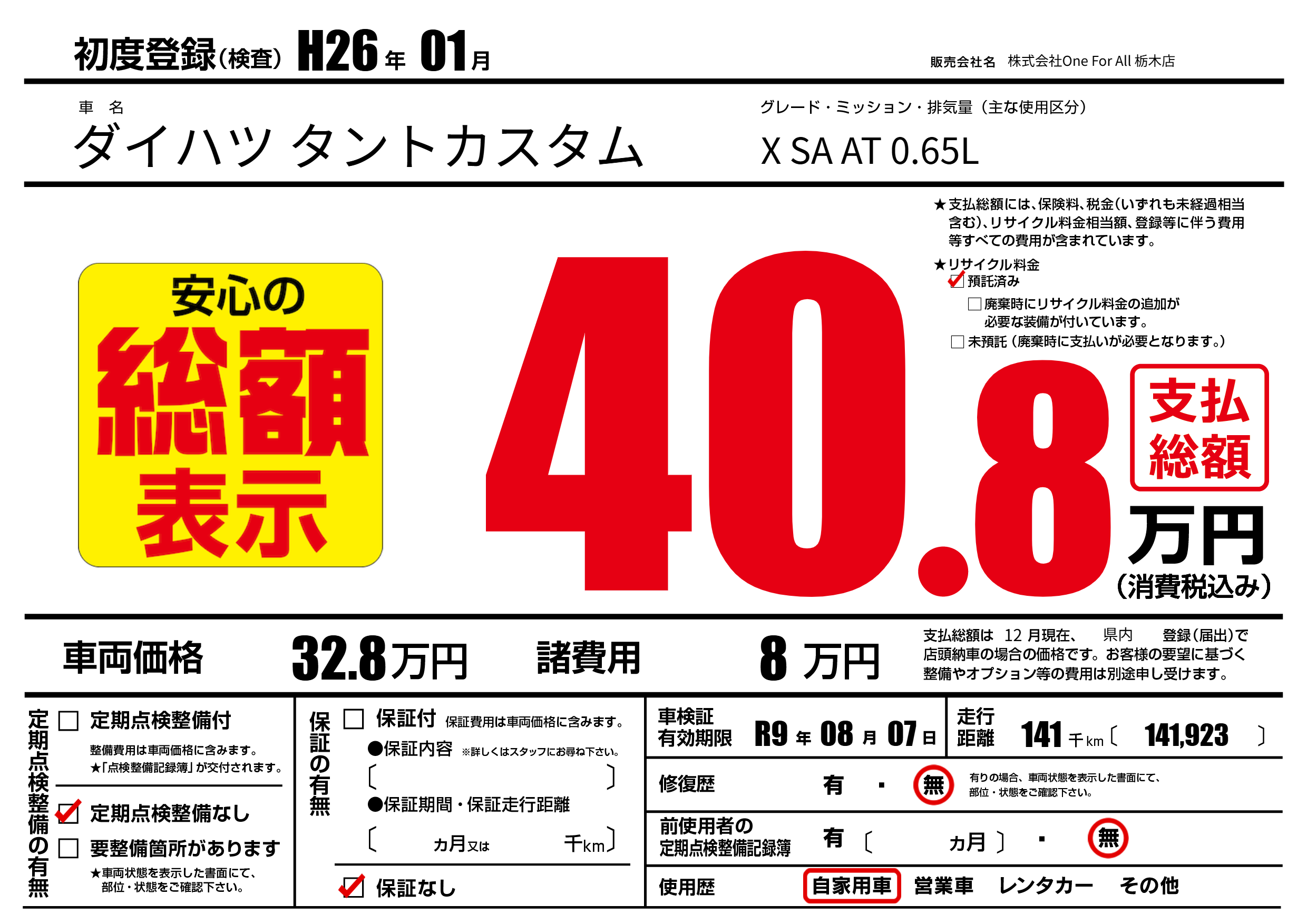 | 車名 | ダイハツ タントカスタム | グレード ミッション 排気量 |