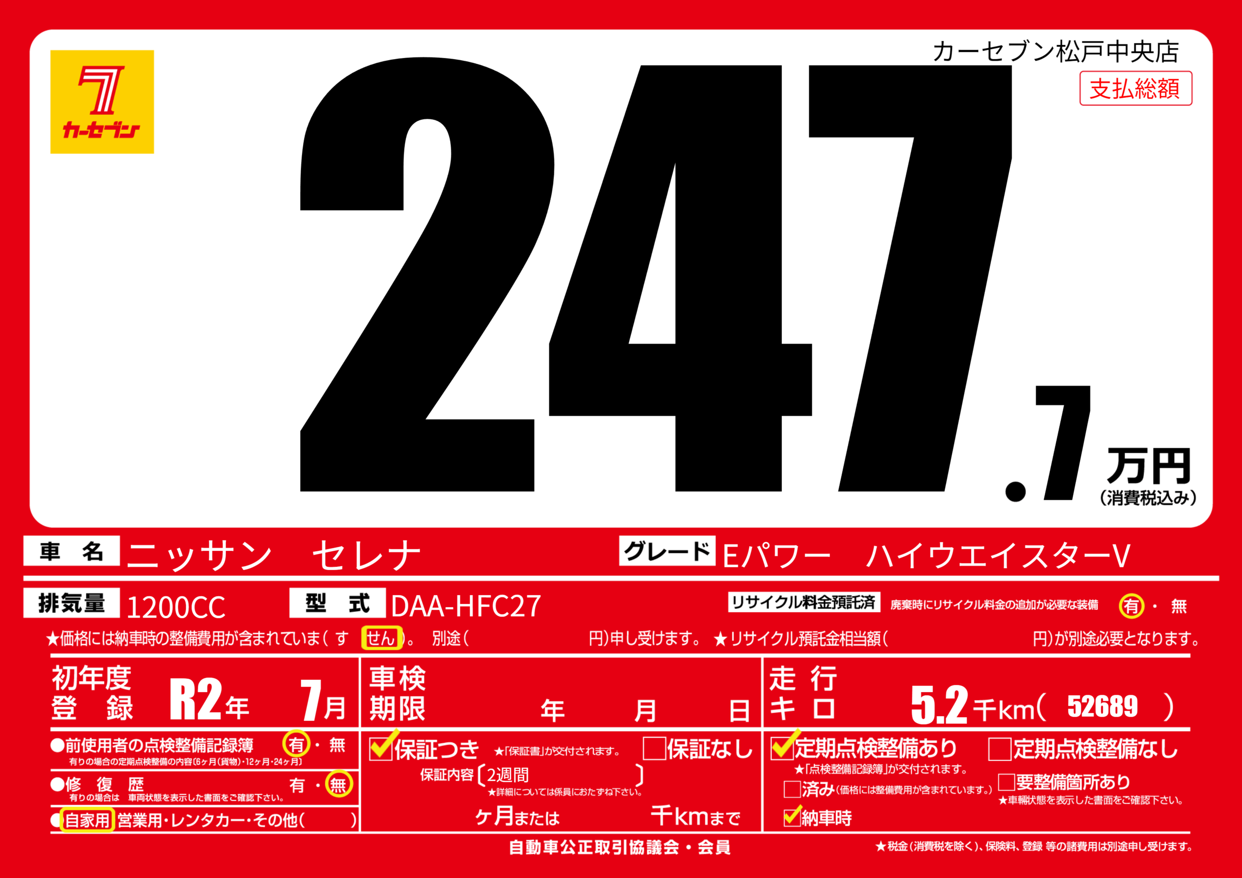 | 車名 | ニッサン セレナ | グレード ミッション 排気量 |