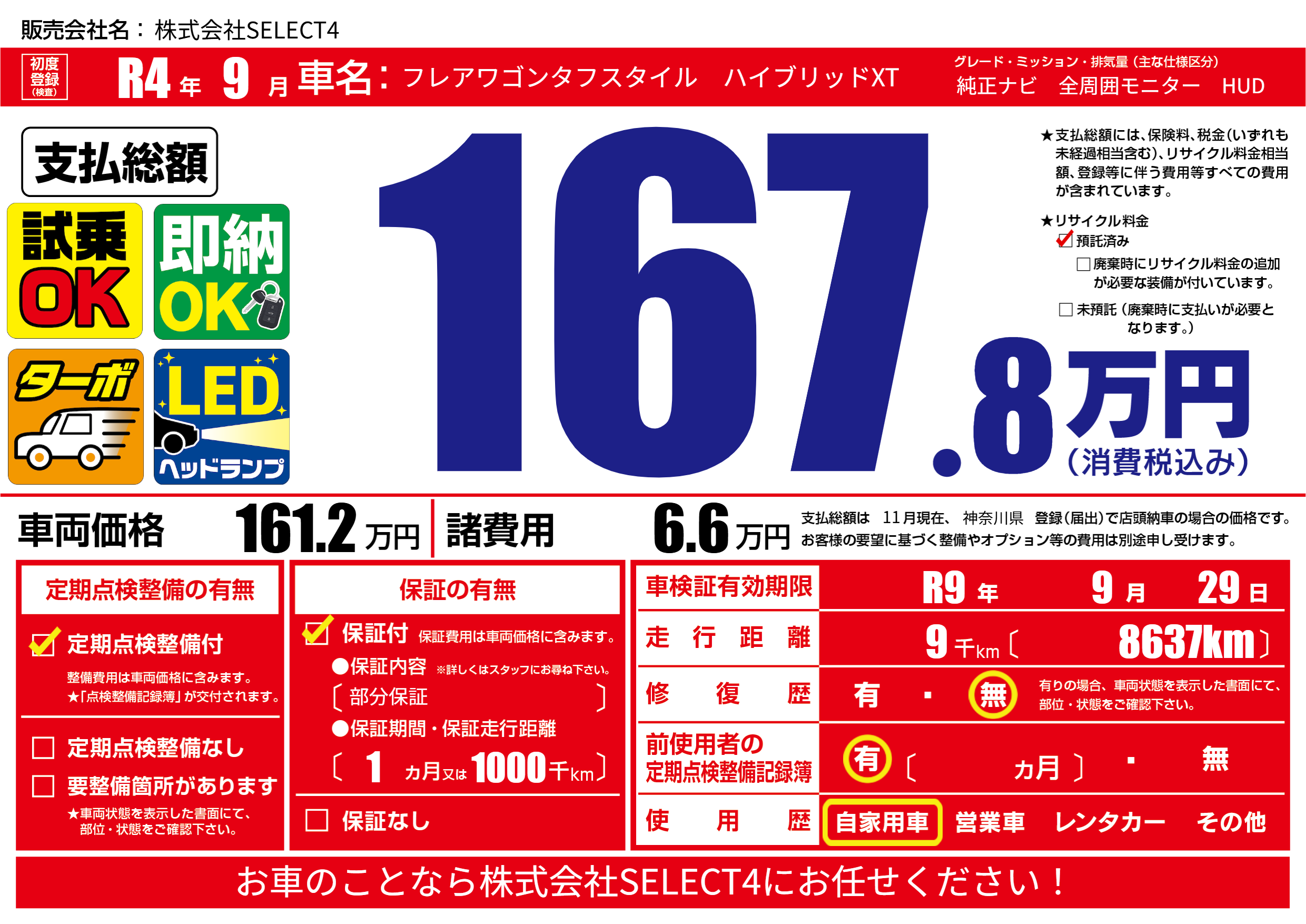 | 走行キロ | 0.9万km | 初年度登録 | R4年9月 |