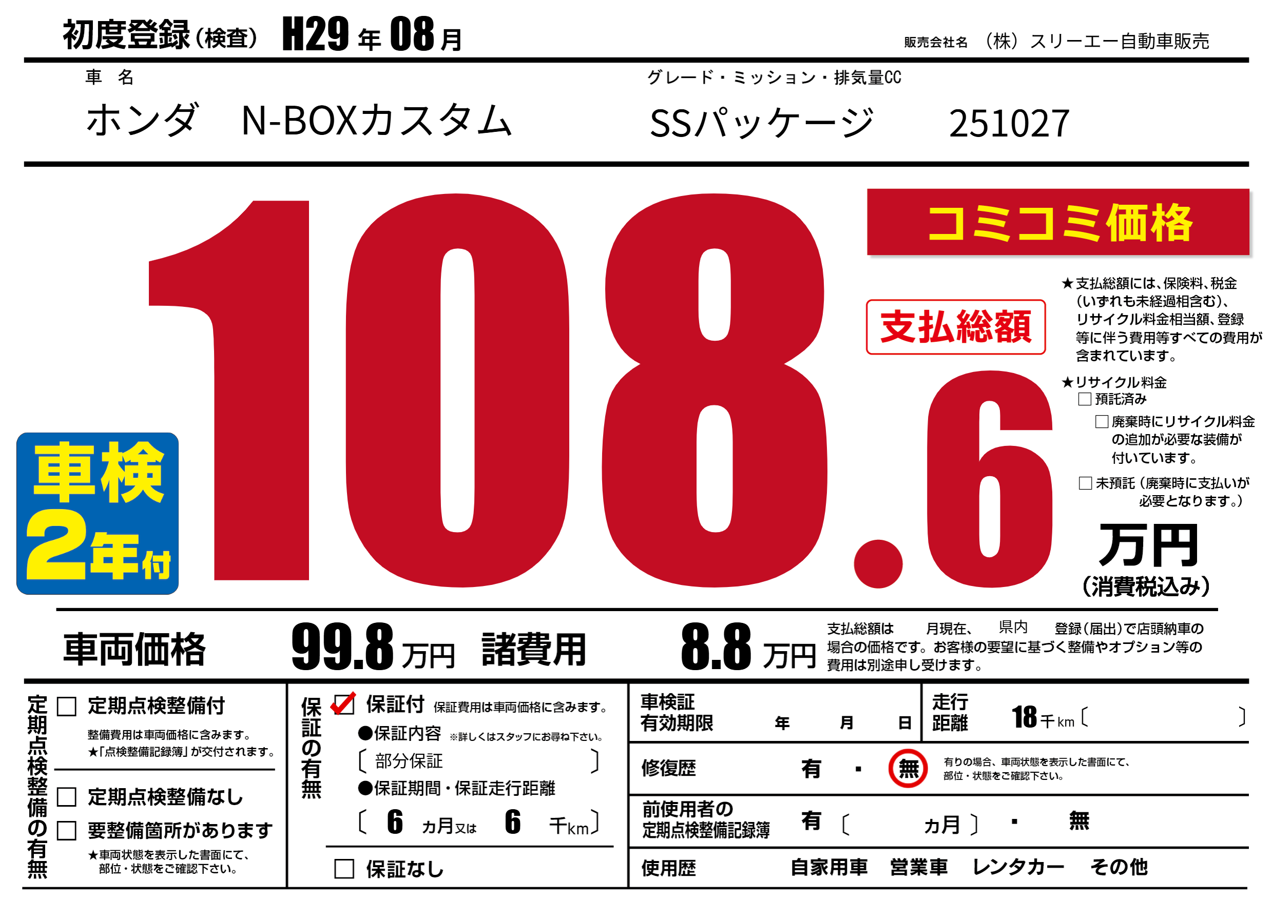 | 走行キロ | 1.8万km | 初年度登録 | H29年08月 |