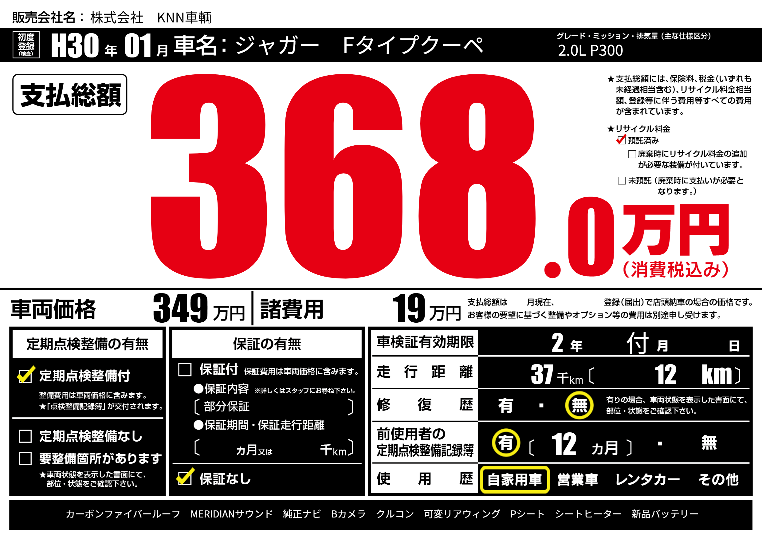 | 車名 | ジャガー Fタイプクーペ | グレード ミッション 排気量 |