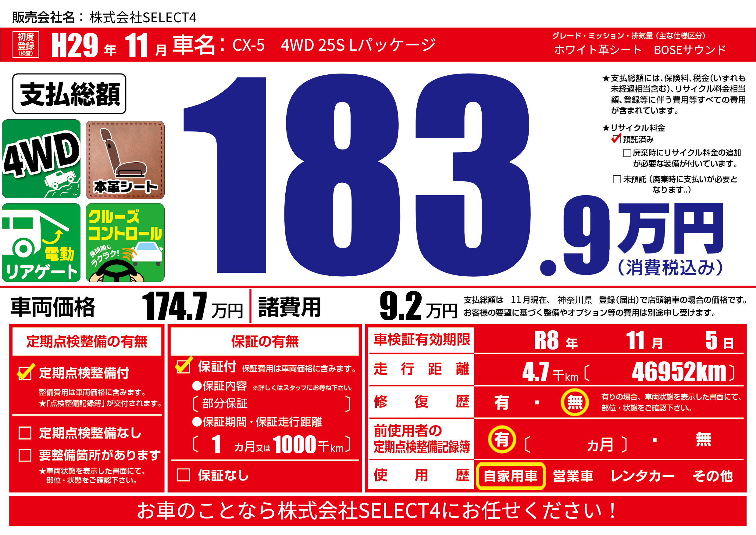 | 車名 | CX-5 4WD 25S Lパッケージ | グレード ミッション 排気量 |