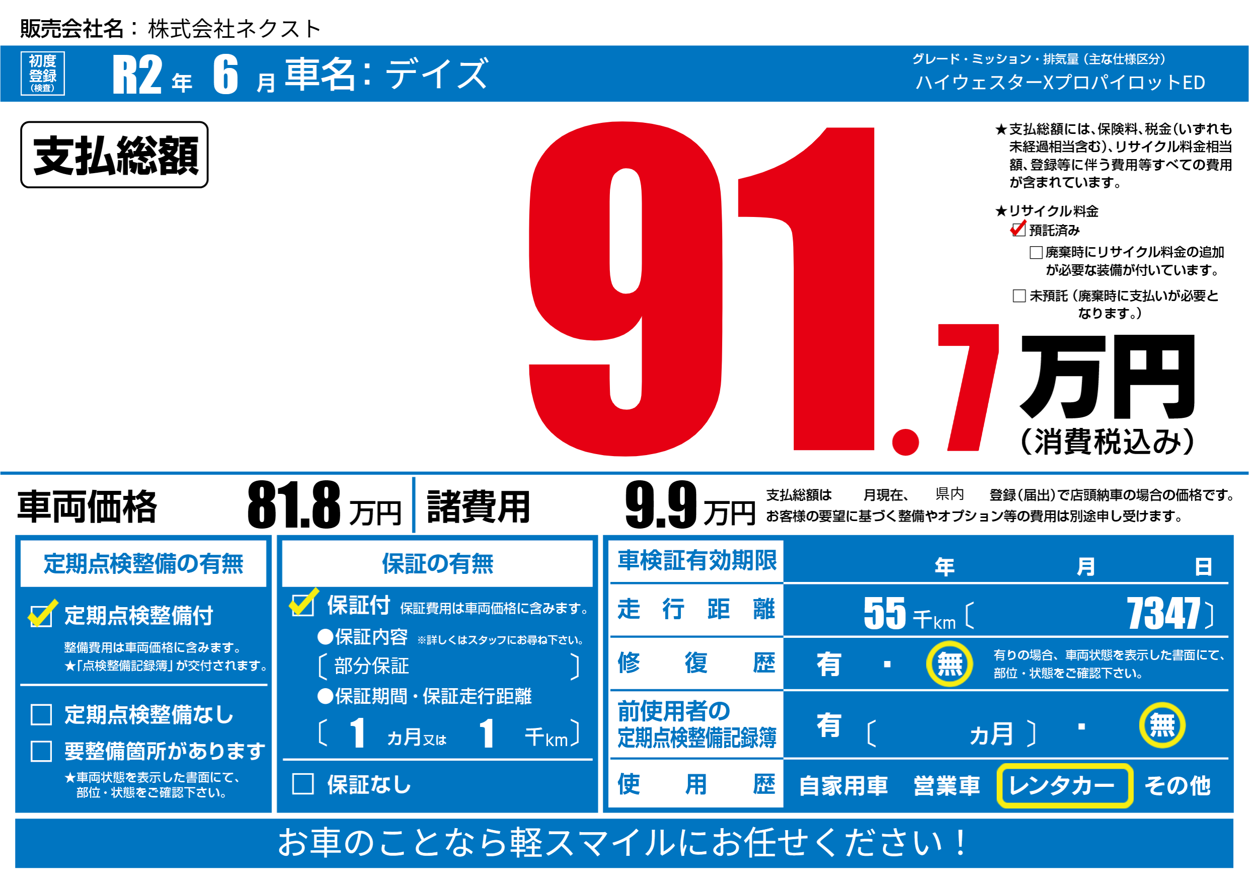 | 車名 | デイズ | グレード ミッション 排気量 |
